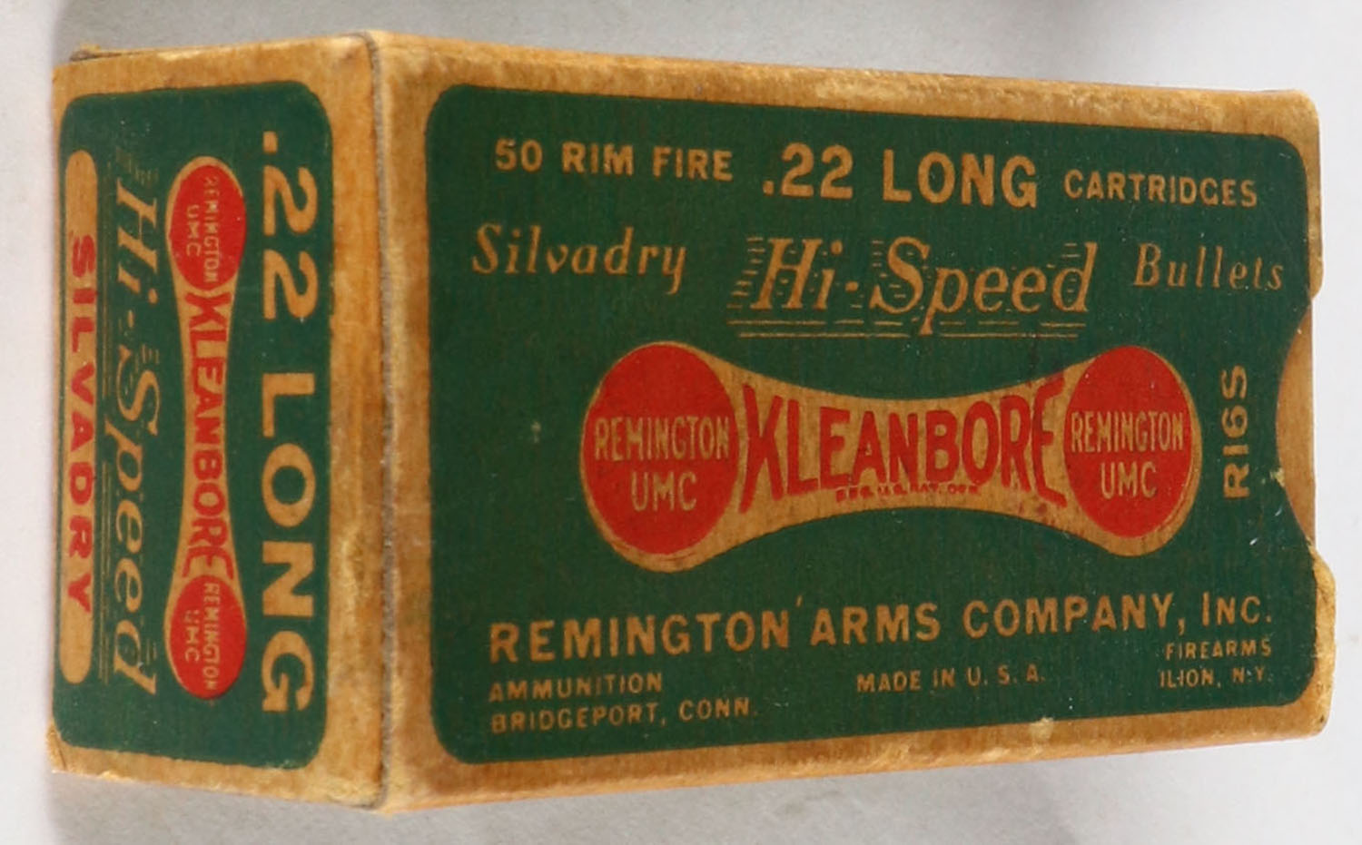 Remington, Silvadry Hi-Speed, .22 Long, RHWeb: REM-7.5 L-1a, Full, 1pc. Green buff & red dog bone box, box is solid with very good color, some age soiling, minor corner wear, edges are mostly crisp, end flaps are solid, ammo is very good. Grade: Very Good ++ - Value: 20 to 60