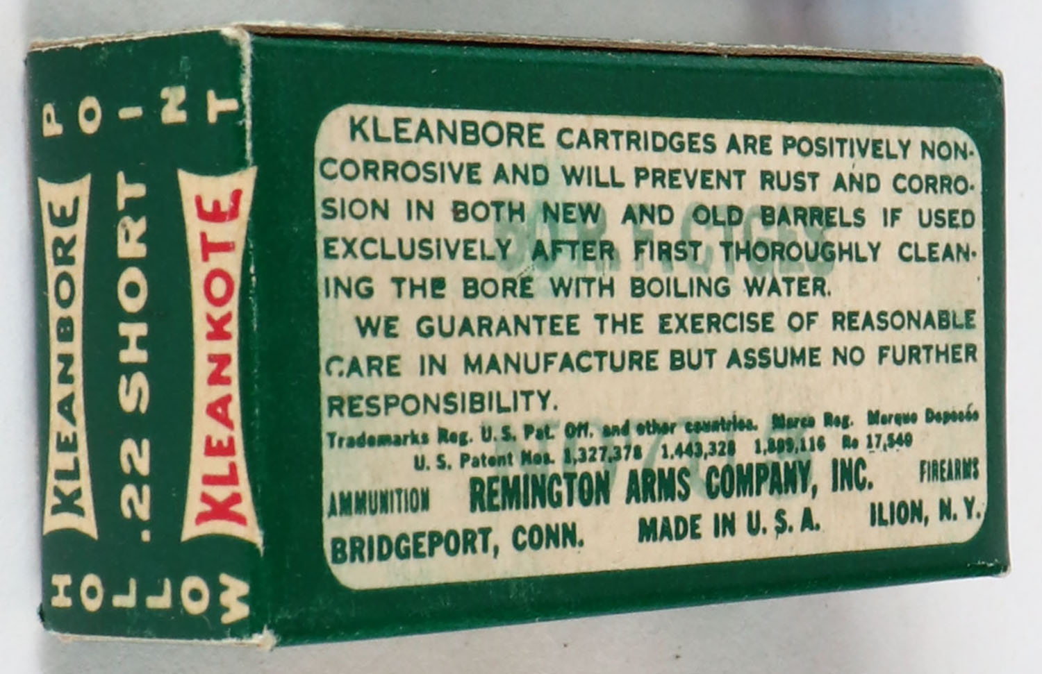 Remington, Kleanbore Kleankote, .22 Short Hollow Point, Standard Velocity, RHWeb: REM-9 S-3c, Full, 1pc. Green white & red box, box is solid with excellent color, very minor corner wear, edges are crisp, end flaps are solid, ammo is excellent. Grade: Excellent ++ - Value: 30 to 90