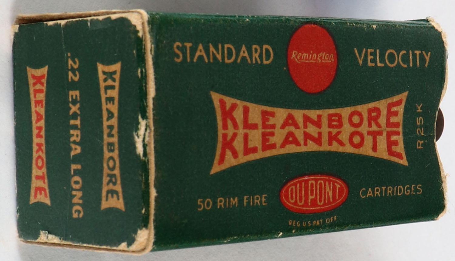 Remington, Kleanbore Kleankote, .22 Extra Long, Standard Velocity, RHWeb: REM-9 XL-1b, Full, 1pc. Green white & red box, missing right end flap, very good to excellent color, some age soiling & corner wear, minor edge wear, left end flap is solid, ammo is very good to excellent. Grade: Very Good - Value: 50 to 150