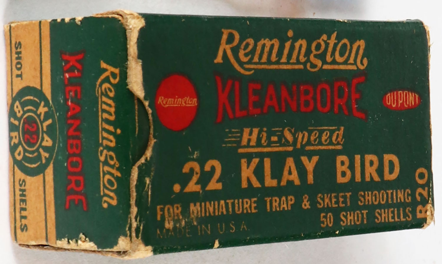 Remington, Kleanbore Hi-Speed, .22 Klay Bird, RHWeb: REM-10 LR-3a, Full, 1pc. Green buff & red box, box is solid with very good color, some age soiling n& corner wear, very minor edge wear, end flaps are solid, ammo is excellent. Grade: Very Good ++ - Value: 10 to 40