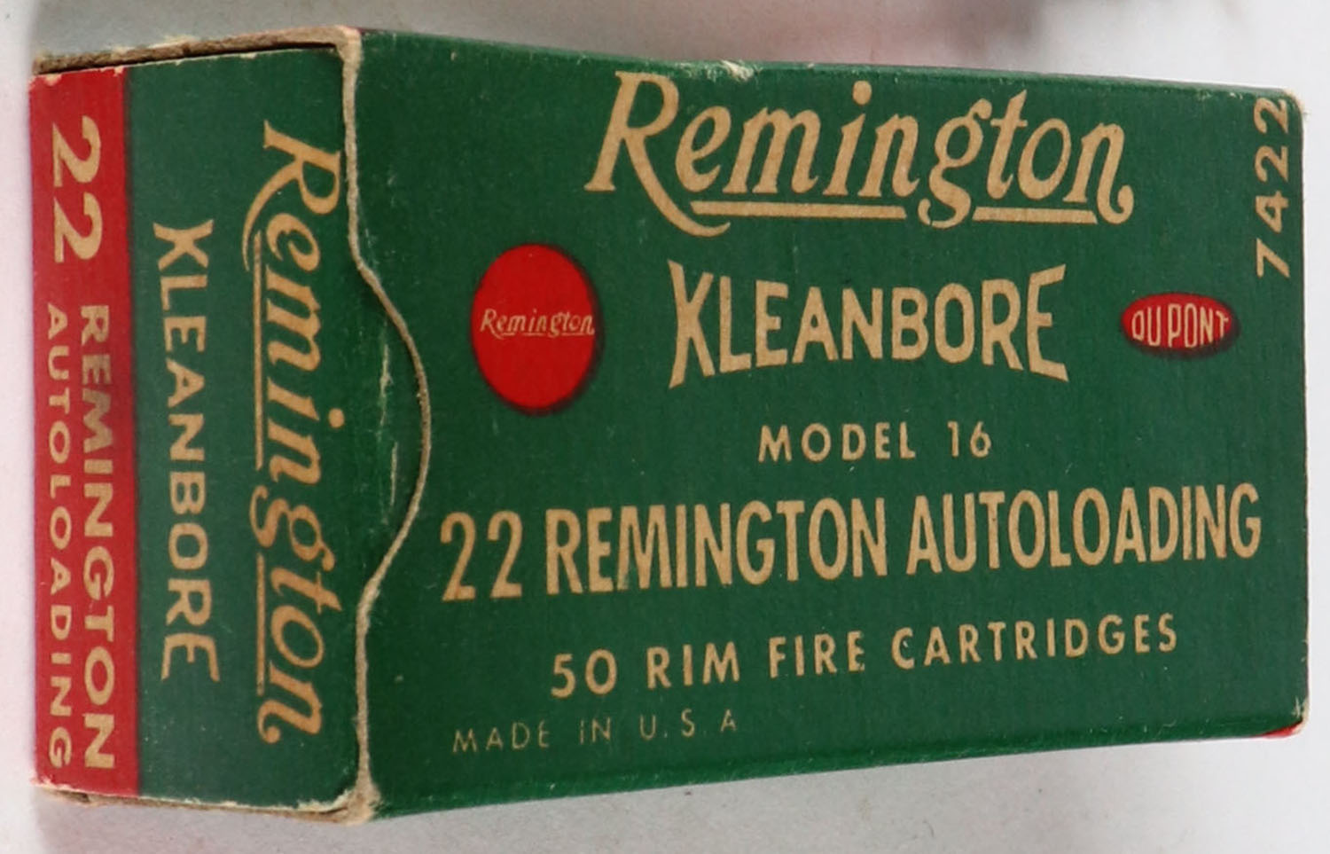 Remington, Kleanbore, .22 Remington Autoloading, RHWeb: REM-12 RA-1b, Full, 1pc. Green red & white box, box is solid with excellent color, minor age soiling, very minor corner wear, edges are crisp, end flaps are solid, ammo is very good to excellent. Grade: Excellent - Value: 40 to 120