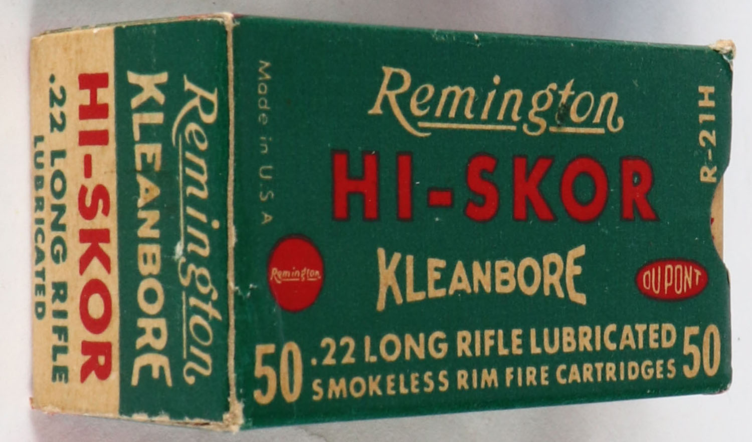 Remington, Hi-Skor Kleanbore, .22 Long Rifle, RHWeb: REM-53 LR-1b, Partial 47rds. 1pc. Green red & white box, box is solid with excellent color, very minor age soiling & corner wear, edges are crisp, end flaps are solid, ammo is very good to excellent. Grade: Excellent + - Value: 8 to 40