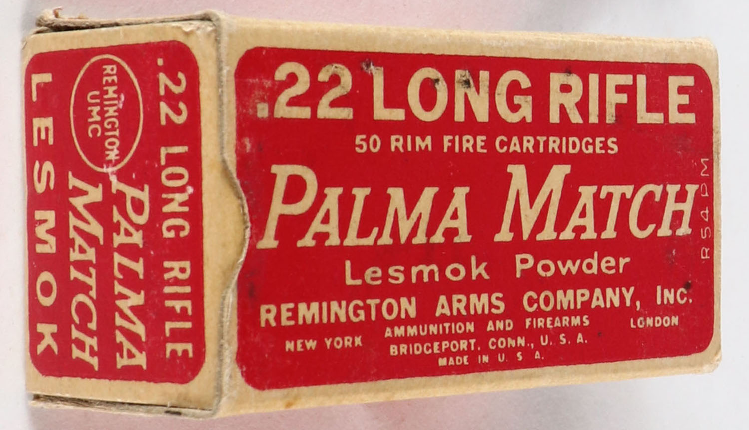 Remington, Palma Match, .22 Long Rifle, RHWeb: REM-52 LR-5b, Full, 1pc. Red & buff box, box is solid with excellent color, very minor age soiling & corner wear, edges are crisp, end flaps are solid, ammo is excellent. Grade: Excellent + - Value: 10 to 40