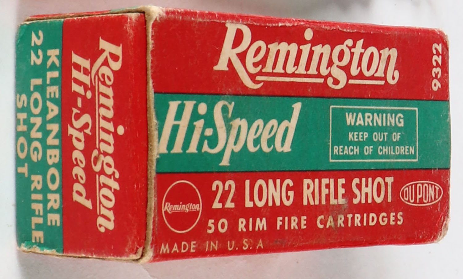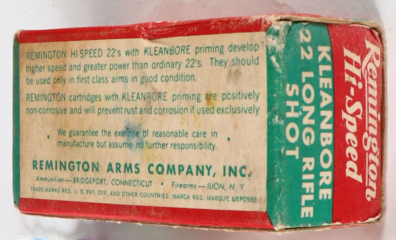 Remington, Hi-Speed, .22 Long Rifle Shot, RHWeb: REM-16 LR-4b, Full, 1pc. Red green & white box, box is solid with very good color, minor age soiling & color fading, some corner wear, very minor edge wear, end flaps are solid, ammo is excellent. Grade: Very Good ++ - Value: 8 to 40