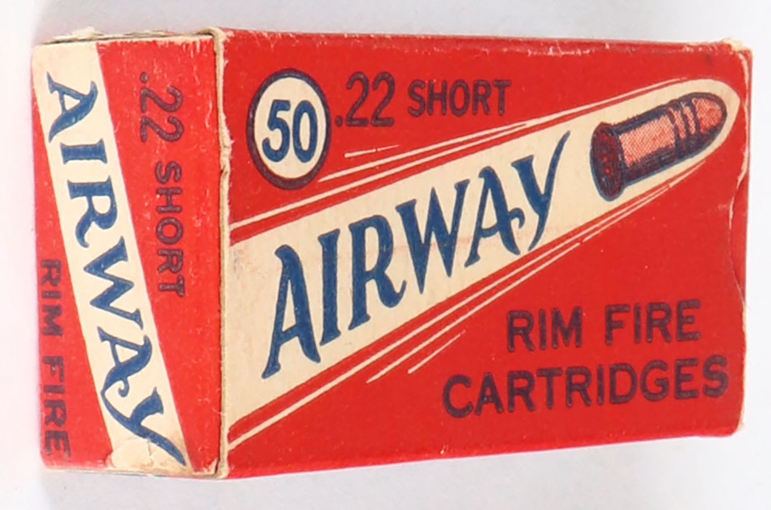 Gambles, Airway, .22 Short, RHWeb: GS-1 S-b, Full, 1pc. Red white & blue box, box is solid with excellent color, very minor age soiling & corner wear, edges are crisp, end flaps are solid, ammo is excellent. Grade: Excellent - Value: 20 to 80