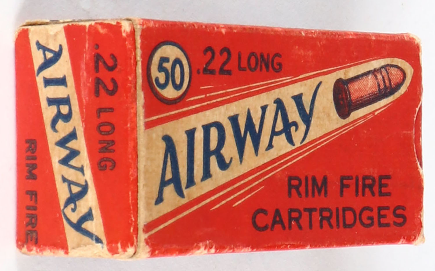 Gambles, Airway, .22 Long, RHWeb: GS-1 L-1c, Full, 1pc. Red white & blue box, box is solid with very good color, some age soiling & corner wear, minor edge wear, end flaps are solid, ammo is excellent. Grade: Very Good ++ - Value: 20 to 80