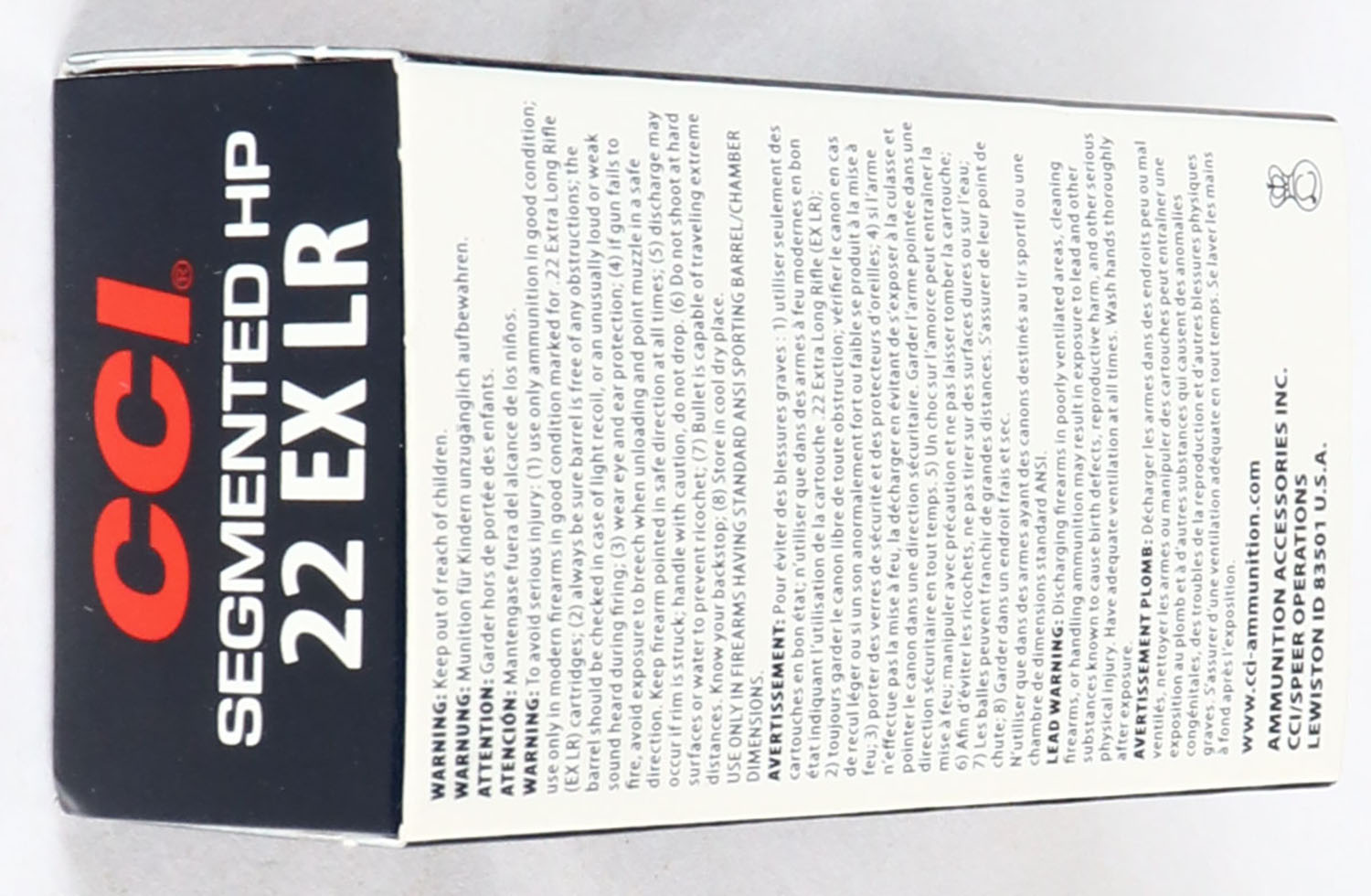 CCi, Segmented HP, .22 EX Long Rifle, 32 Grain Segmented Hollow Point, 1640 FPS, Full, 1pc. Blue white & red box, box is MINT with mint color, corners are sharp, edges are crisp, end flaps are solid, ammo is mint. Grade: MINT - Value: 10 to 50