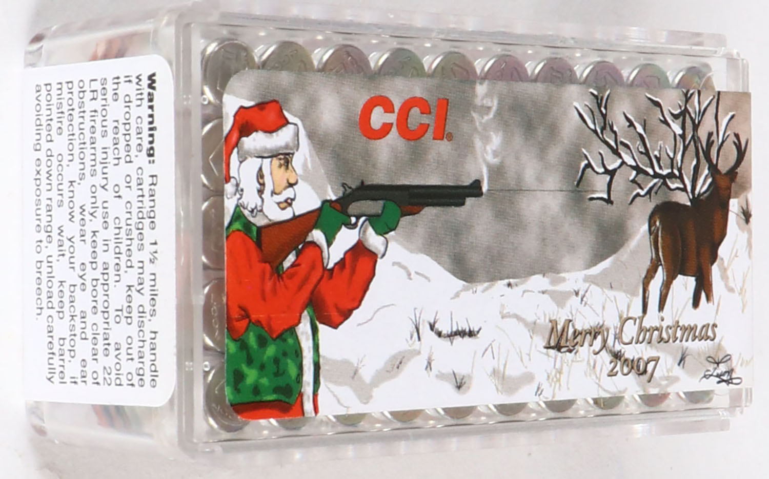 CCi, Merry Christmas 2007, .22 Short Hollow Point, RHWeb: CCI-19 S-1, FULL & SEALED, 2pc. Clear plastic tray with label featuring Santa on a late season deer hunt, plastic tray is clean & clear, label is intact with minty color. Grade: MINT - Value: 40 to 120