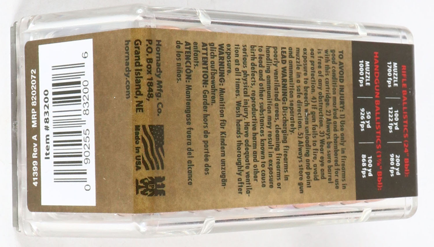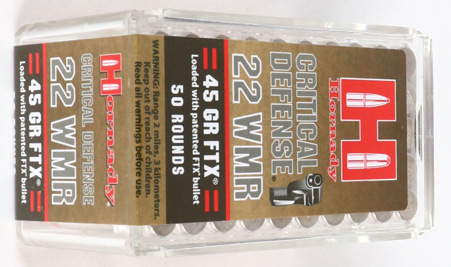 Hornady Critical Defense, .22 Mag, 45 Gr. FTX, 1700 FPS from 24'' barrel, 1000 FPS from 1 7/8'' barrel, FULL & SEALED, 2pc. Clear plastic tray with red & black sealing label, box is MINT with mint color, label is mint, ammo appears mint. Grade: MINT - Value: 16 to 32