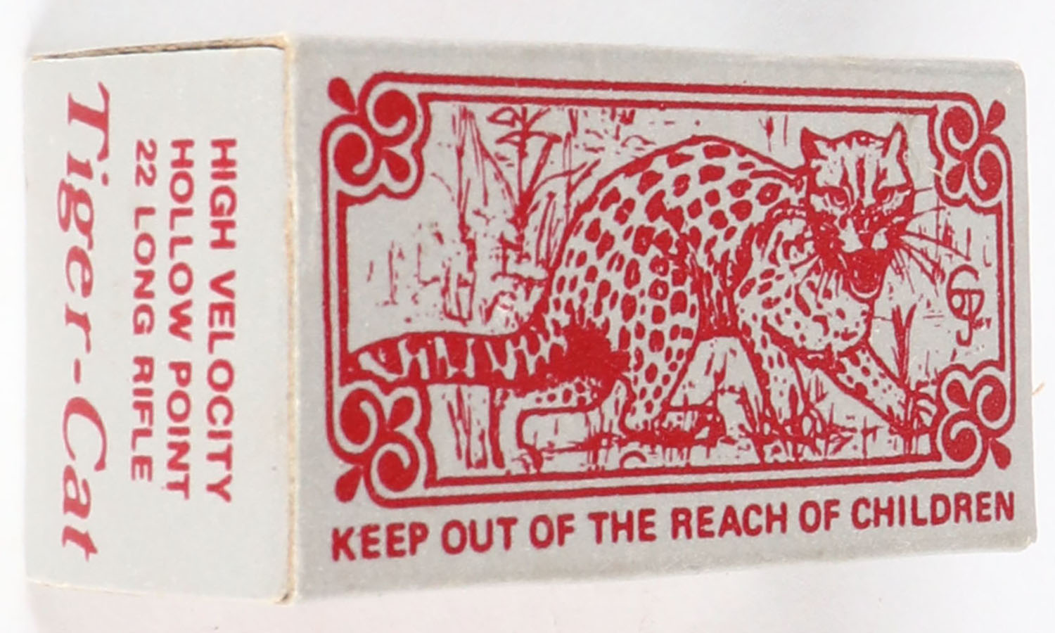Sovereign, Tiger-Cat, .22 Long Rifle Hollow Point, RHWeb: SGD-1 LR-2, Full, 1pc. Silver & red box, box is near mint with minty color, only very minor edge wear, corners are mostly sharp, end flaps are solid, ammo is excellent. Grade: Excellent ++ - Value: 30 to 90