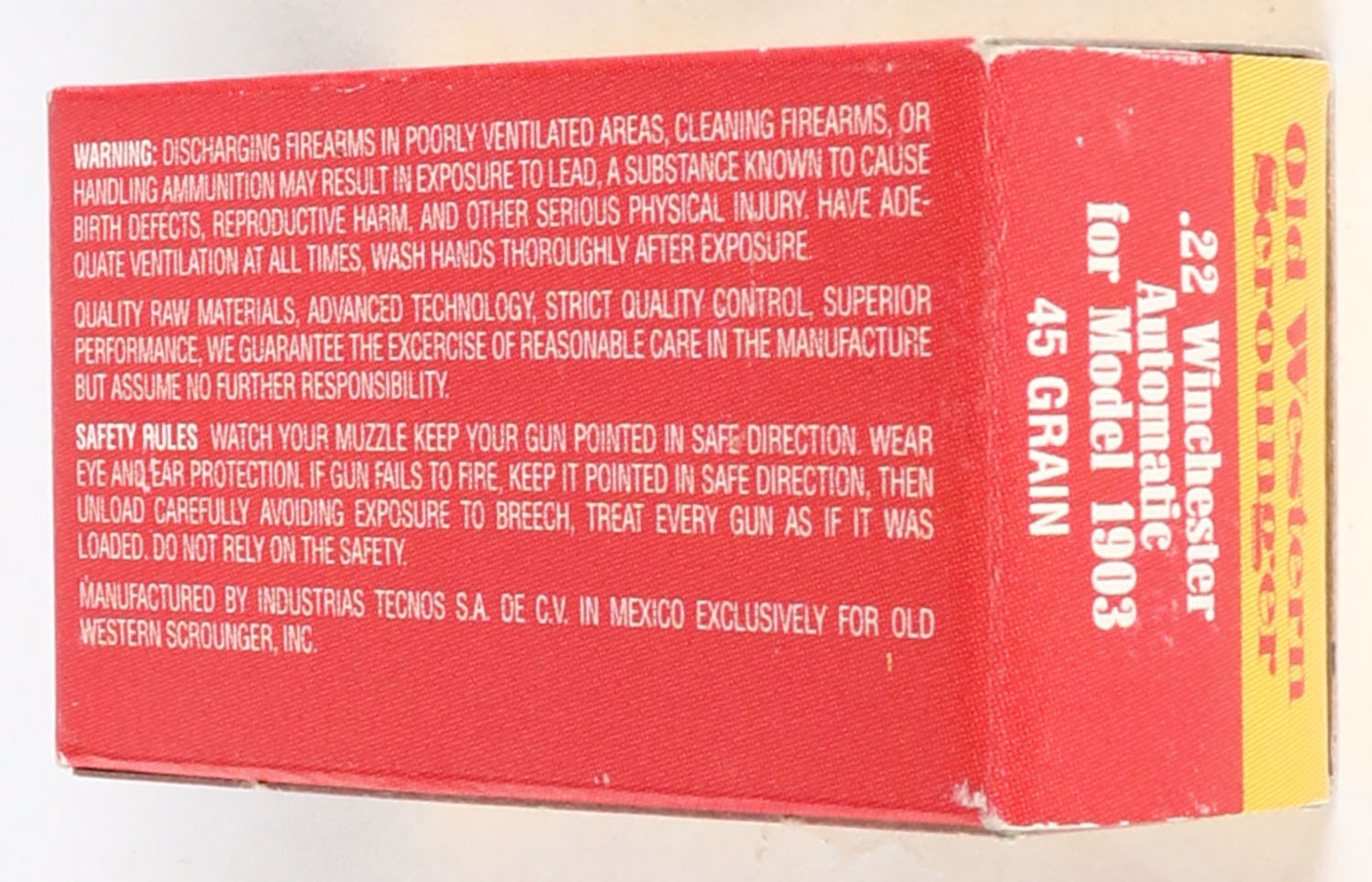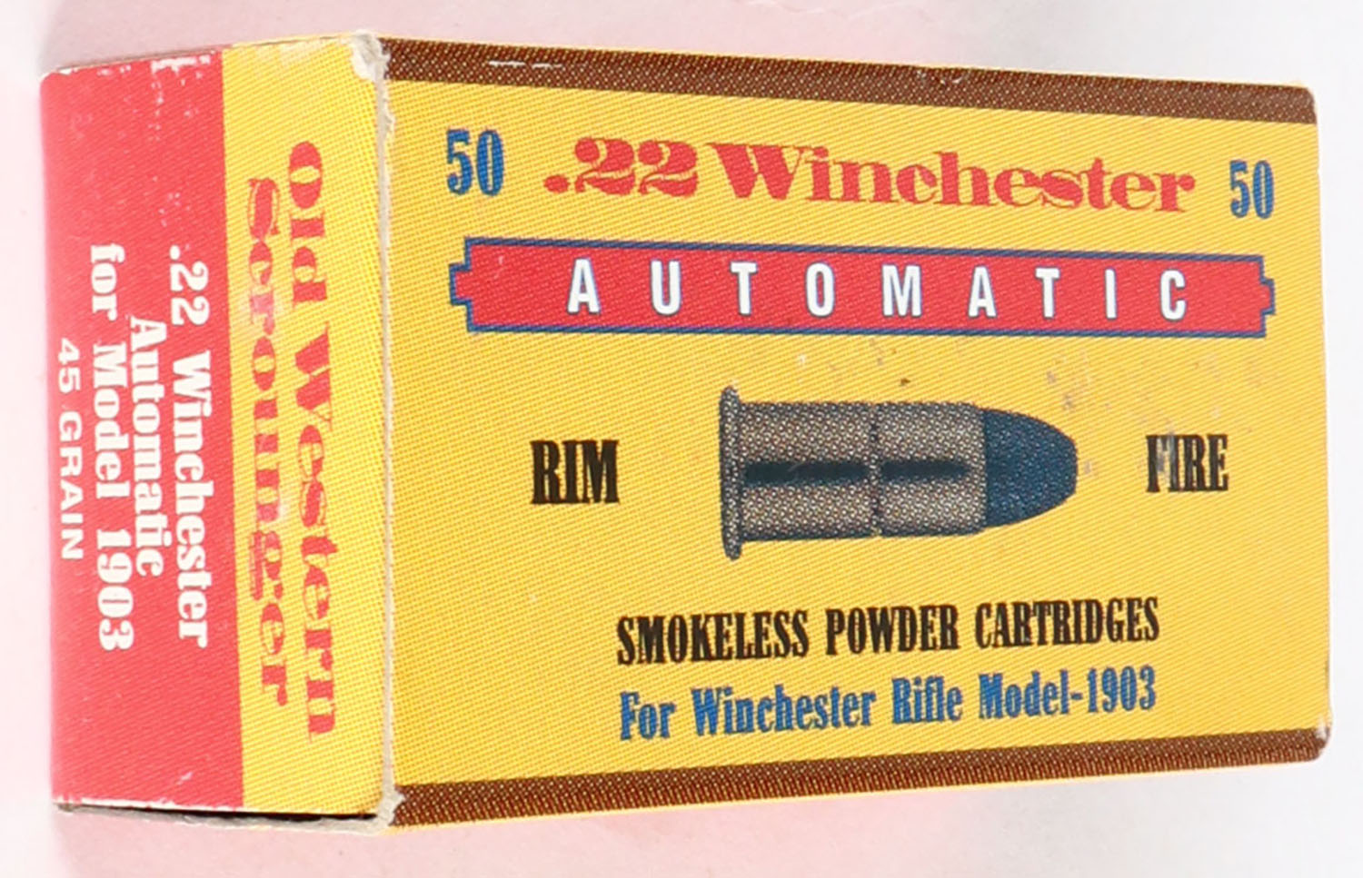 Old Western Scrounger, .22 Winchester Automatic, RHWeb: IT-10 WA-1, Full, 1pc. Yellow & red box, box is MINT with mint color, sharp corners, crisp edges, rigid end flaps, ammo is mint. Grade: MINT - Value: 20 to 60