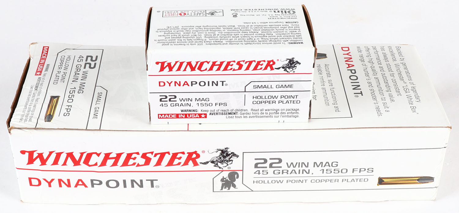 Winchester, DynaPoint, .22 Win. Mag., 45 Grain Copper Plated Hollow Point, 1550 FPS, Full, 250rds. 1pc. white & red brick with black printing, brick is solid with mint color, corner ding on top corner, ding has not translated to inside boxes, corners otherwise mostly sharp, edges are crisp, top flap is solid, inside boxes are mint. Grade: Excellent - Value: 50 to 150