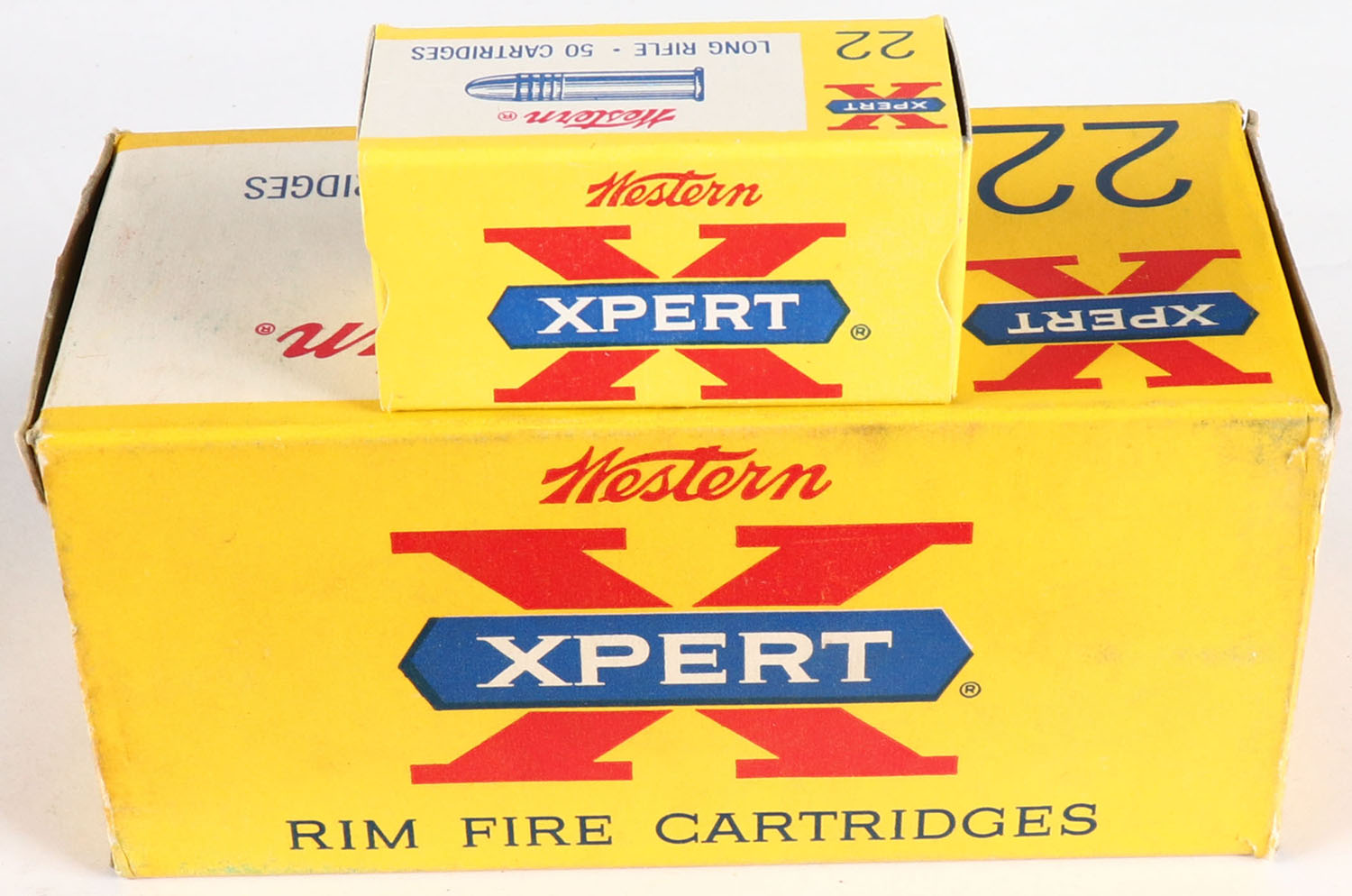 Western, Xpert, .22 Long Rifle, Partial 7 boxes, 1pc. Yellow red & blue brick, brick is solid with excellent color, very minor age soiling & shelf wear, very minor corner wear, edges are crisp, end flaps are solid, inside boxes are minty. Grade: Excellent - Value: 20 to 80