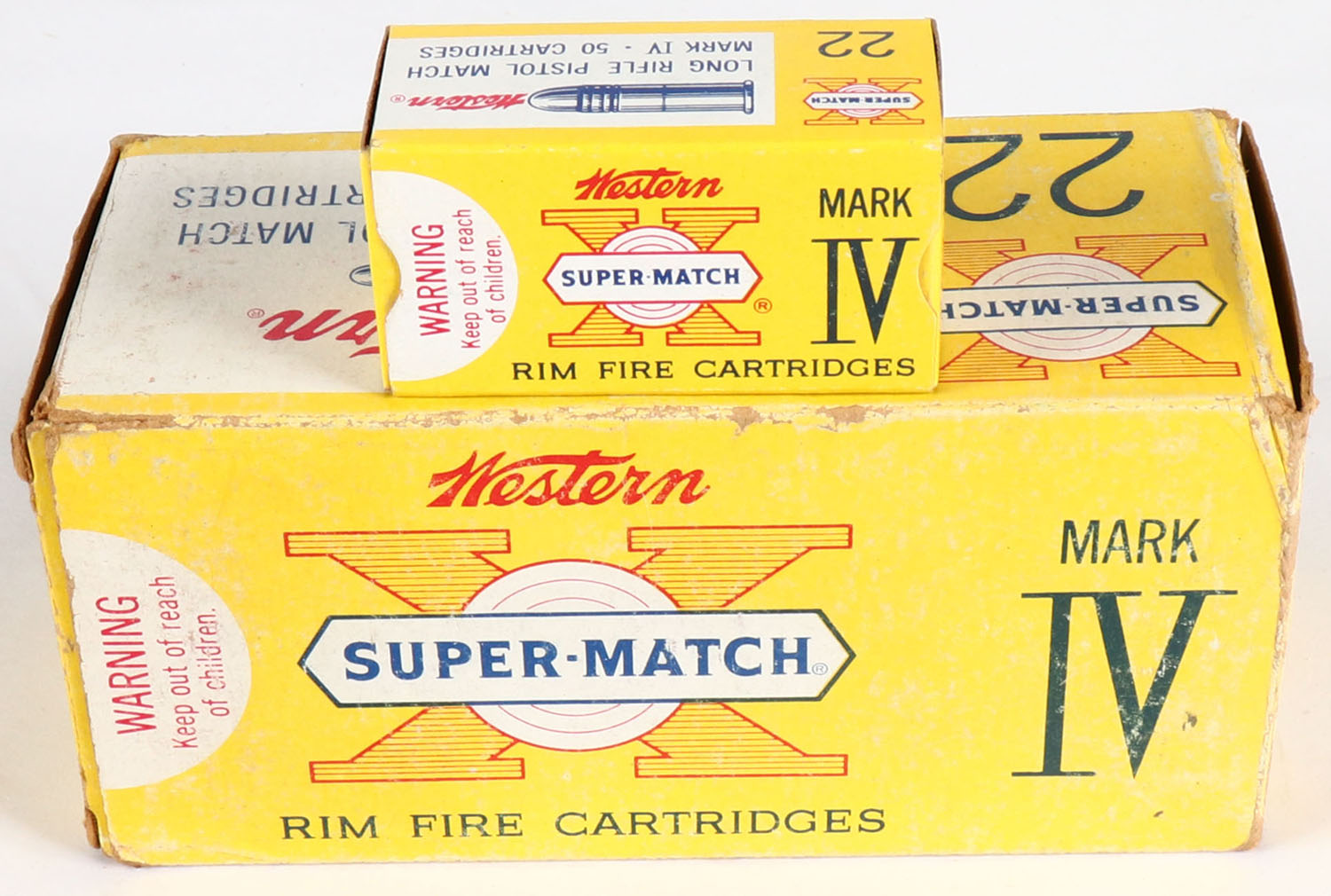 Western, Super-Match Mark IV, .22 Long Rifle, Pistol Match, Full, 500rds. 1pc. Yellow white & red brick, left end flap is torn & taped, good to very good color, minor age soiling, some shelf & corner wear, minor edge wear, right end flap is solid, inside boxes are minty. Grade: Very Good - Value: 20 to 80