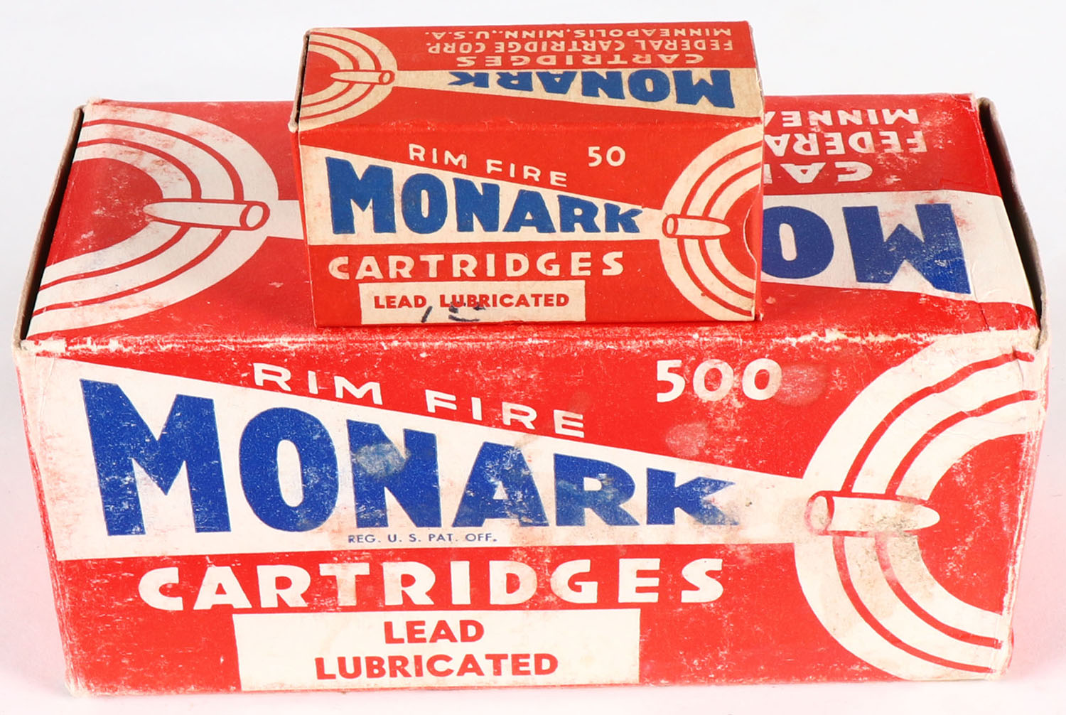 Federal, Monark, .22 Long Rifle, Lead Lubricated, Full, 500rds. 1pc. Red white & blue brick, brick is solid with very good color, shelf wear, corner wear, some edge wear, end flaps are solid, inside boxes are excellent. Grade: Very Good + - Value: 30 to 90