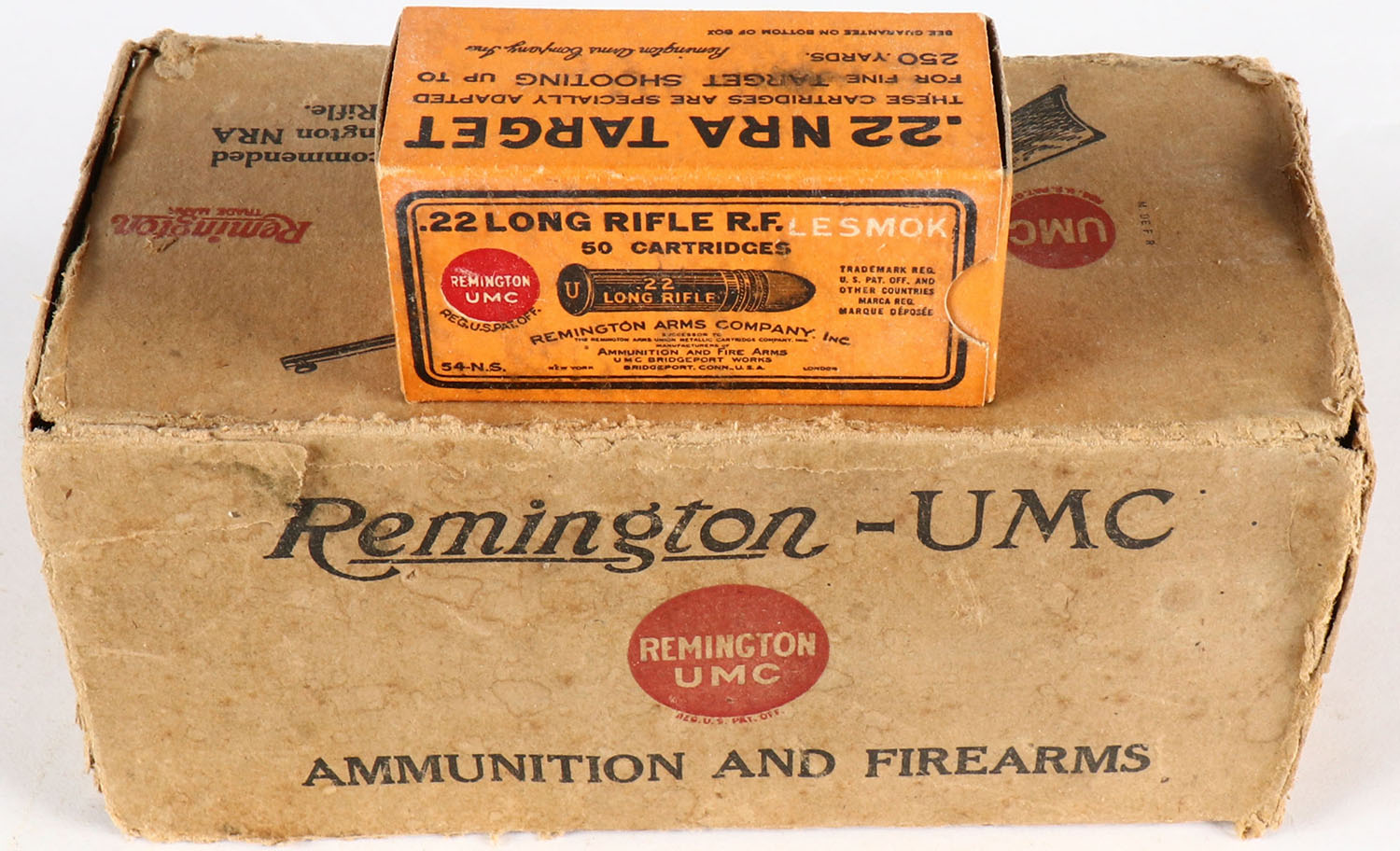 REM-UMC, R.F. Lesmok Cartridges, .22 Long Rifle, Full, 500rds. 1pc. Buff black & red brick, factory seam has unadhered, both end flaps are torn, edge & corner wear, inside boxes are excellent. Grade: Fair - Value: 150 to 450