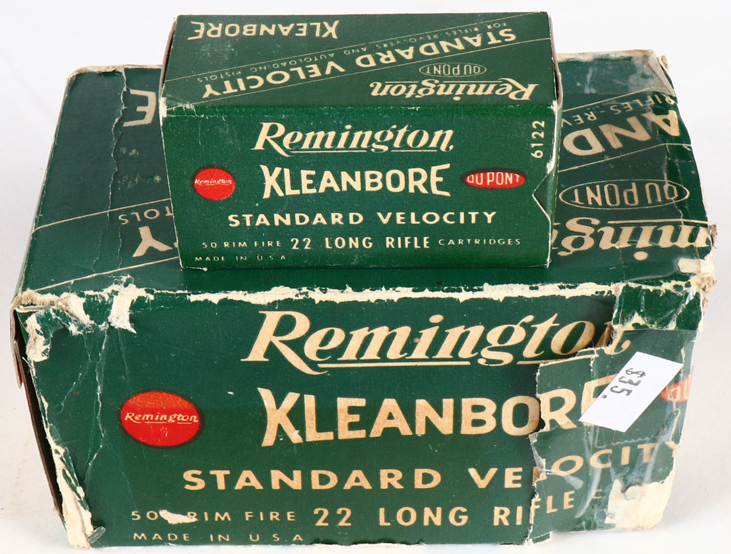 Remington, Kleanbore Standard Velocity, .22 Long Rifle, Partial 8 boxes, 1pc. Green white & red brick, brick is missing both end flaps and is covered in tape, edge & corner wear, inside boxes are excellent to minty. Grade: Fair - Value: 20 to 60