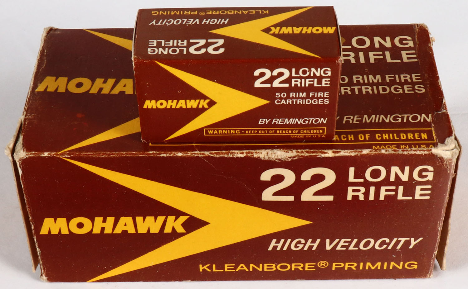 Remington, Mohawk, .22 Long Rifle, High Velocity, Full, 500rds. 1pc. Brown yellow & white brick, brick is solid with very good to excellent color, minor shelf wear & color fading, some corner wear, minor edge wear, left end flap is solid, right end flap is partially torn, inside boxes are minty. Grade: Very Good ++ - Value: 30 to 90