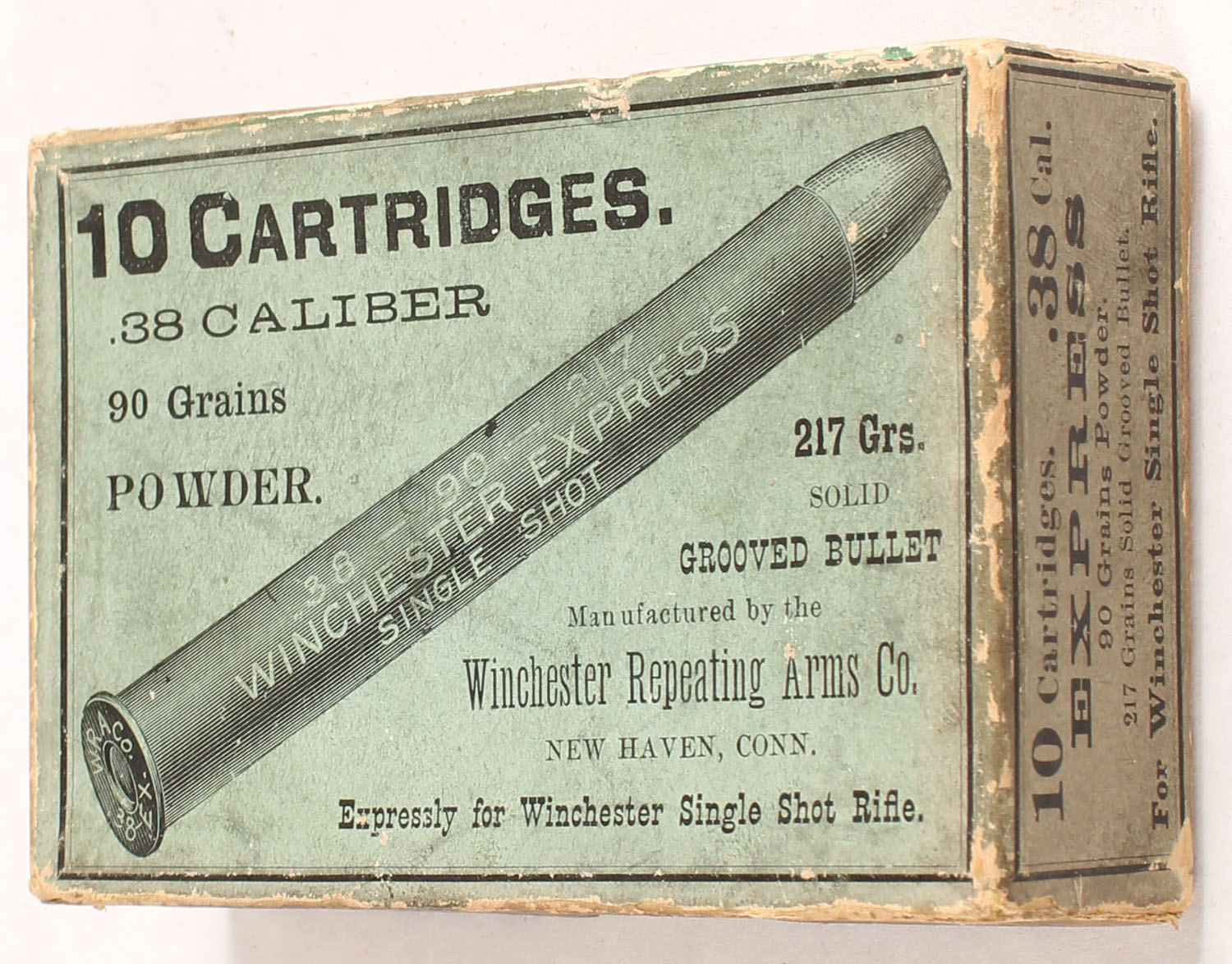 Winchester, .38-90-217 Winchester Express, Single Shot, Full, 2pc. Buff box with blue label, box is solid with very good to excellent color, some age soiling, some edge & corner wear, label is intact, ammo is excellent. Grade: Excellent - Value: 200 to 600