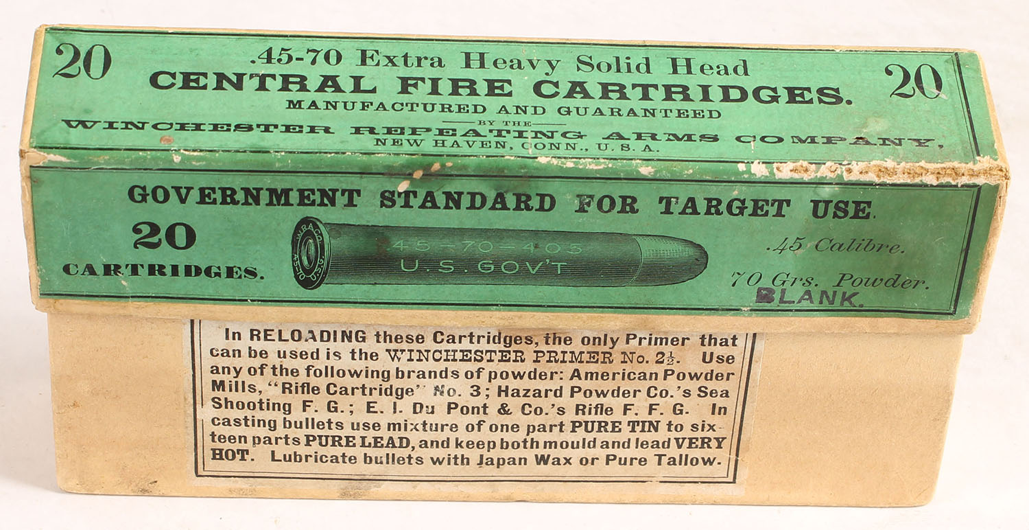 Winchester, Central Fire Cartridges, .45-70-405 Blank, Full, 2pc. Buff box with green label, box is solid with excellent color, some staining, very minor edge & corner wear, label is intact, ammo is excellent. Grade: Very Good ++ - Value: 30 to 120