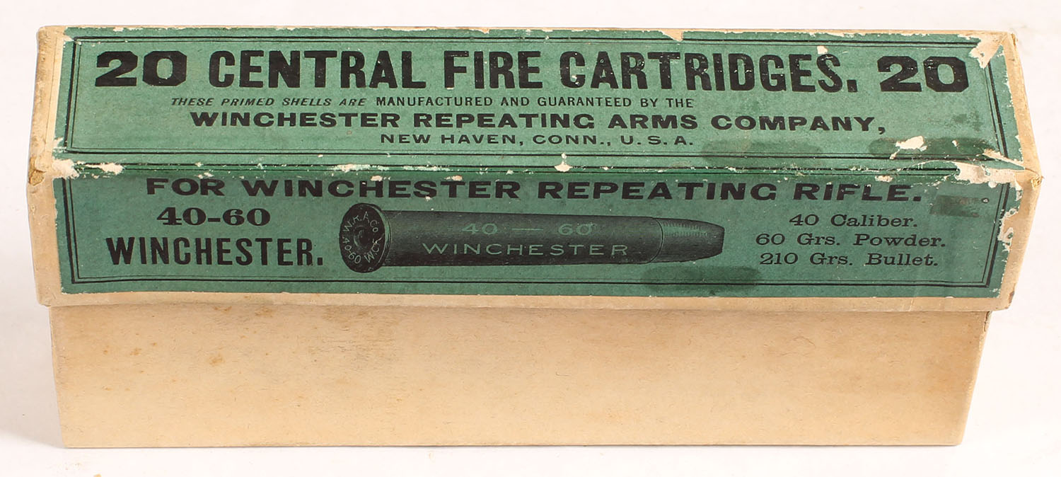 Winchester, Central Fire Cartridges, .40-60 Winchester, 210 Grs. Bullet, Full, 2pc. Buff box with green label, box is solid with excellent color, minor age soiling & staining, minor corner ear, very minor edge wear, label is intact, ammo is excellent. Grade: Excellent - Value: 100 to 400
