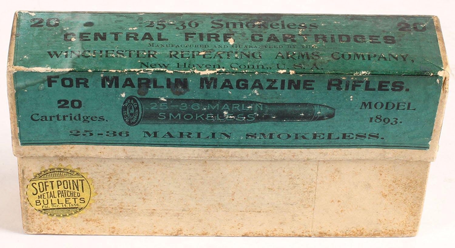 Winchester, Central Fire Cartridges, .25-36 Marlin, Smokeless, Full, 1pc. Buff box with green label, box is solid with very good color, some age soiling & shelf wear, some staining, minor edge & corner wear, back side has been written on, label is solid, ammo is excellent. Grade: Very Good - Value: 100 to 300