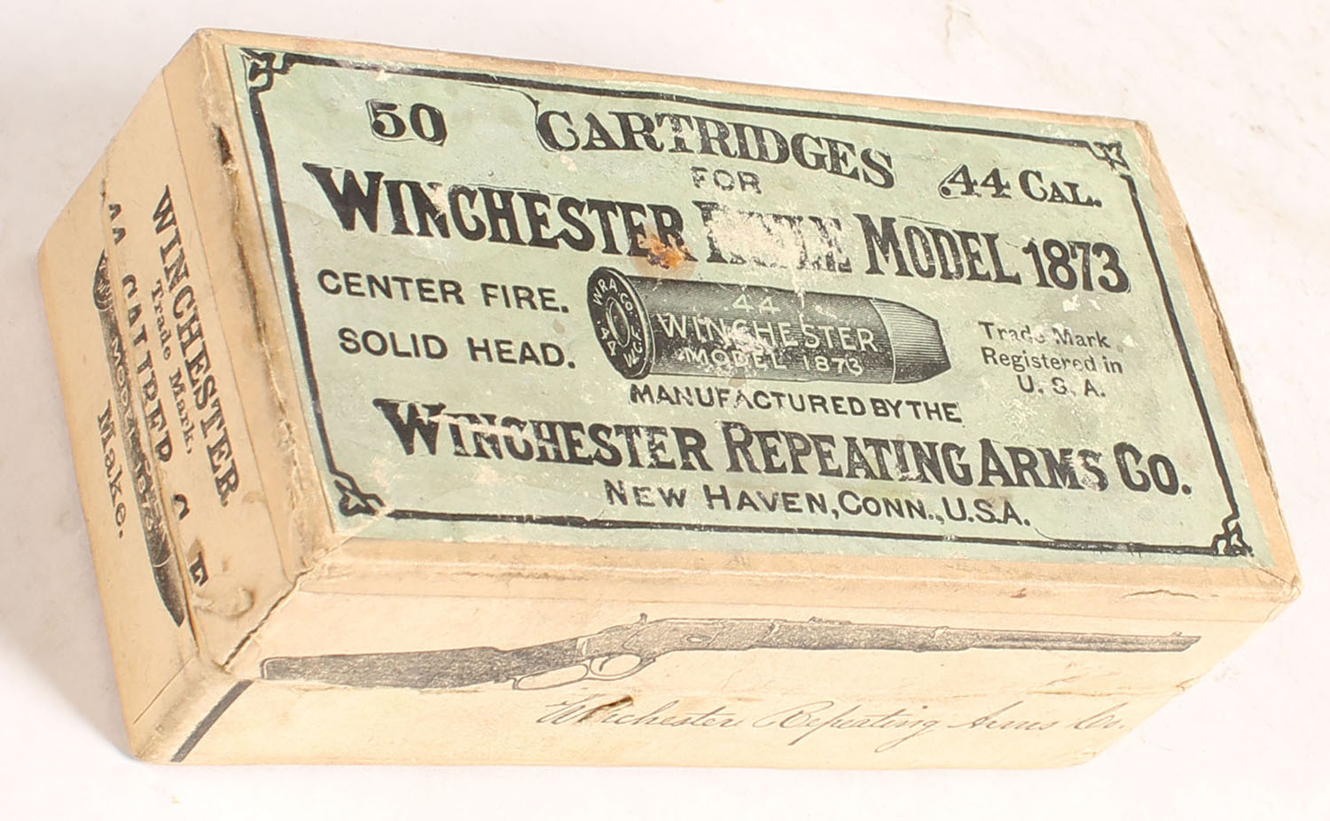 Winchester, Cartridges for Model 1873, .44 Winchester, Full of mixed WRA H/S ammo, 1pc. Buff box with green top & buff side sealing labels, box is solid with very good color, some age soiling & staining, some shelf wear, partial seam split top right edge, some edge & corner wear, labels are intact, ammo is good to very good. Grade: Good ++ - Value: 80 to 240