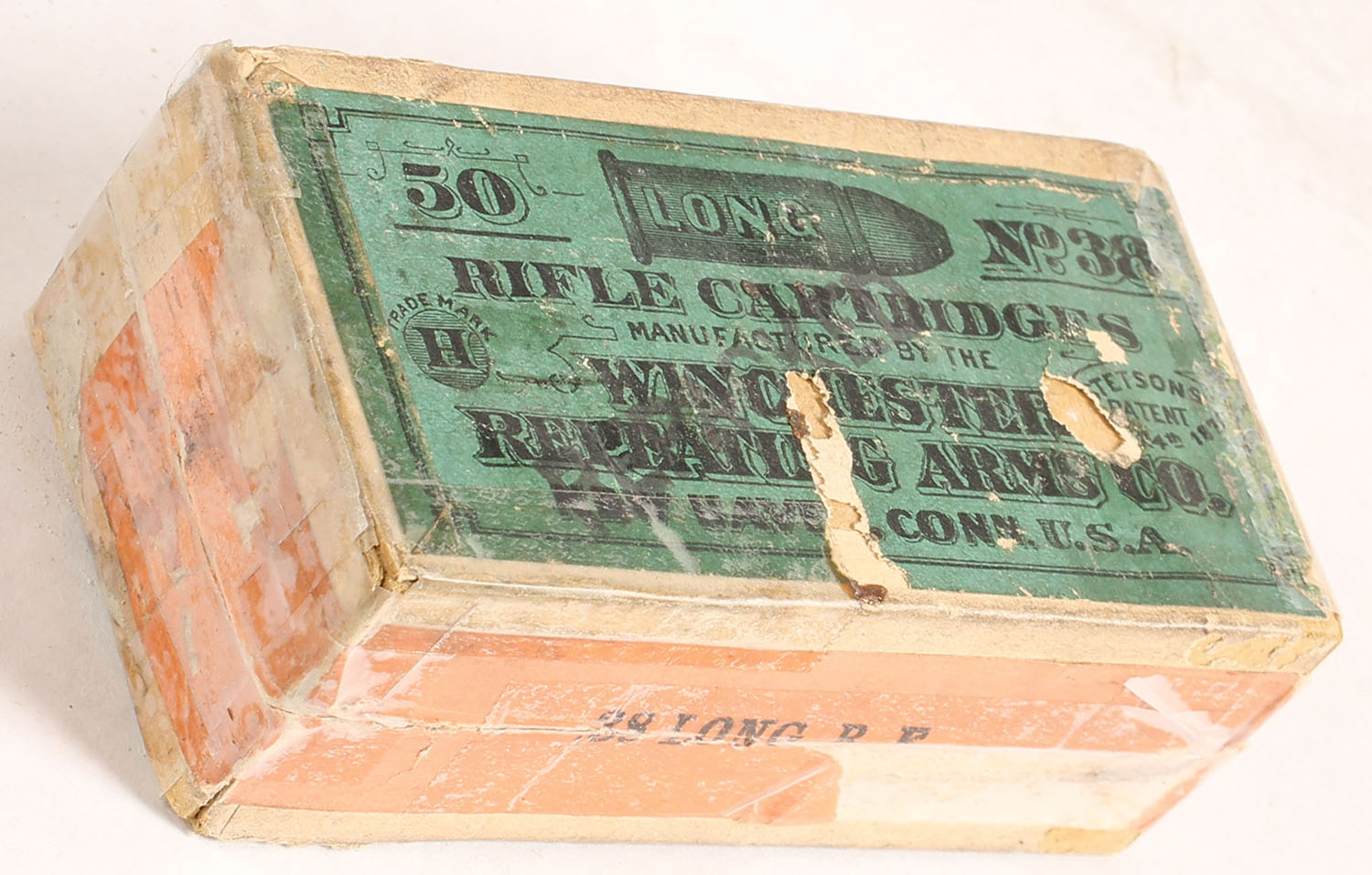 Winchester, Rifle Cartridges, .38 Long Rim Fire, Repacked, Full, 2pc. Buff box with green top & orange side sealing labels, ''Repacked'' over-stamp on top, box is almost completely covered in tape, very good color, some age soiling, shelf wear, chipping to labels, some edge & corner wear, side sealing label is 50% intact, ammo is excellent. Grade: Good - Value: 20 to 60