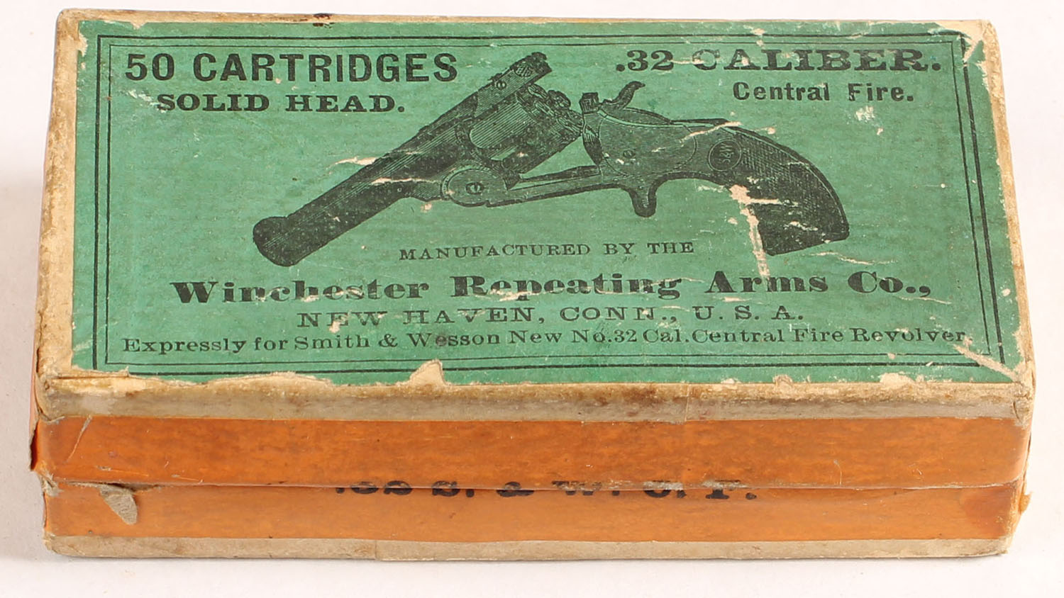 Winchester, Solid Head Central Fire, .32 Smith & Wesson, Partial 17rds. 2pc. Buff box with green top & orange side sealing labels, box is solid with very good to excellent color, minor age soiling & shelf wear, some edge & corner wear, labels are intact, ammo is good. Grade: Very Good ++ - Value: 10 to 50