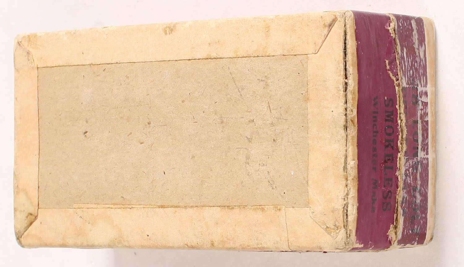 Winchester, Center Fire Cartridges, .38 Long Colt, Full, 2pc. Buff box with red top & purple side sealing labels, box is solid with very good color, minor age soiling, all lid edges are taped, some shelf wear, some edge & corner wear, labels are intact, ammo is good. Grade: Good + - Value: 30 to 90