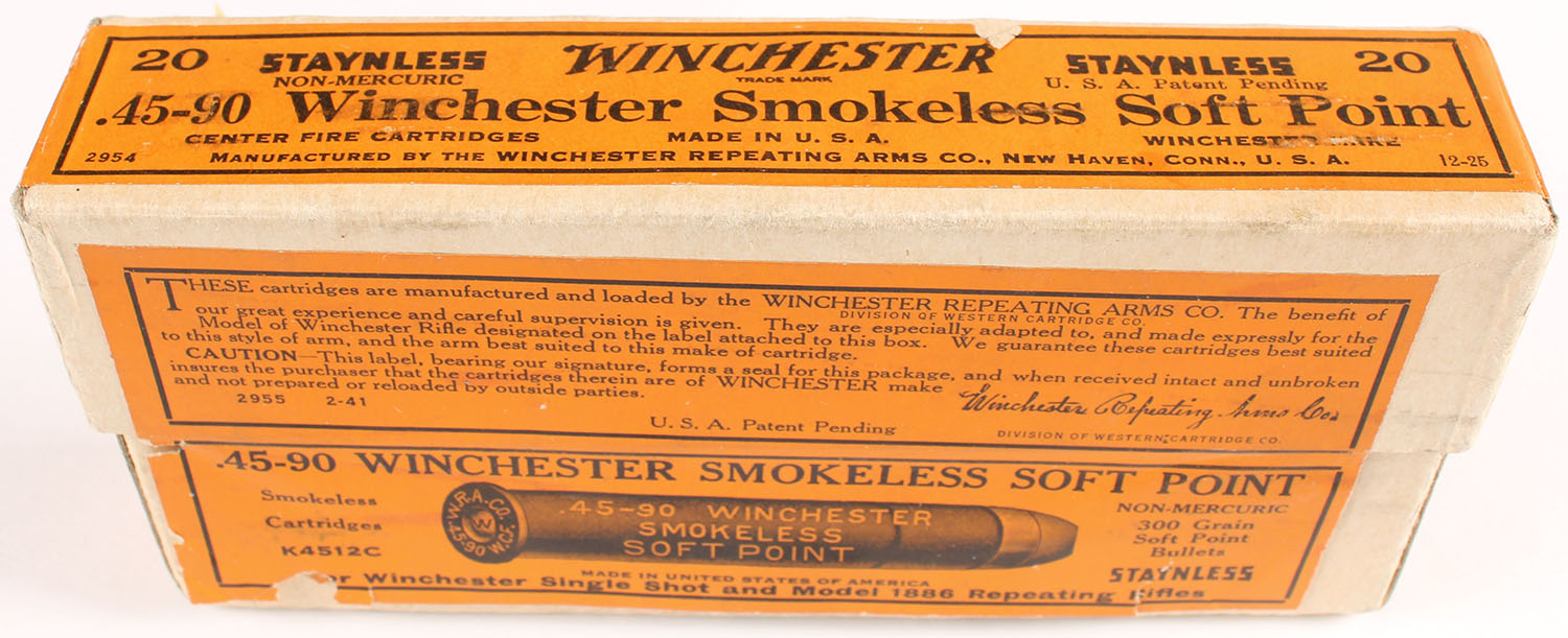Winchester, Staynless Non-Mercuric, .45-90 Winchester, 300 Grain Soft Point Bullets, Full, 2pc. Buff box with orange labels, box is solid with minty color, very minor corner wear, edges are mostly crisp, labels are intact, ammo is excellent. Grade: Excellent ++ - Value: 60 to 180