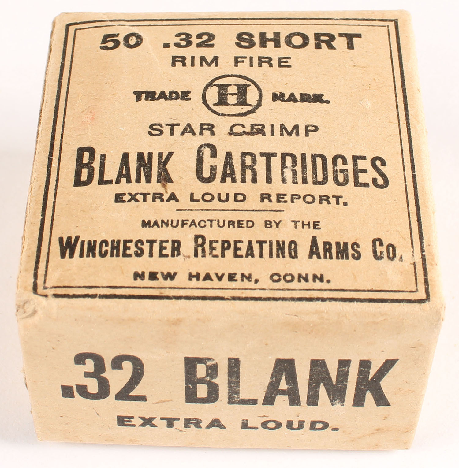 Winchester, Blank Cartridges, .32 Short Rim Fire, Extra Loud Report, Full, 1pc. Buff box with black printing, box is solid with excellent color, minor corner wear, very minor edge wear, flaps are solid, ammo is good. Grade: Excellent - Value: 8 to 40