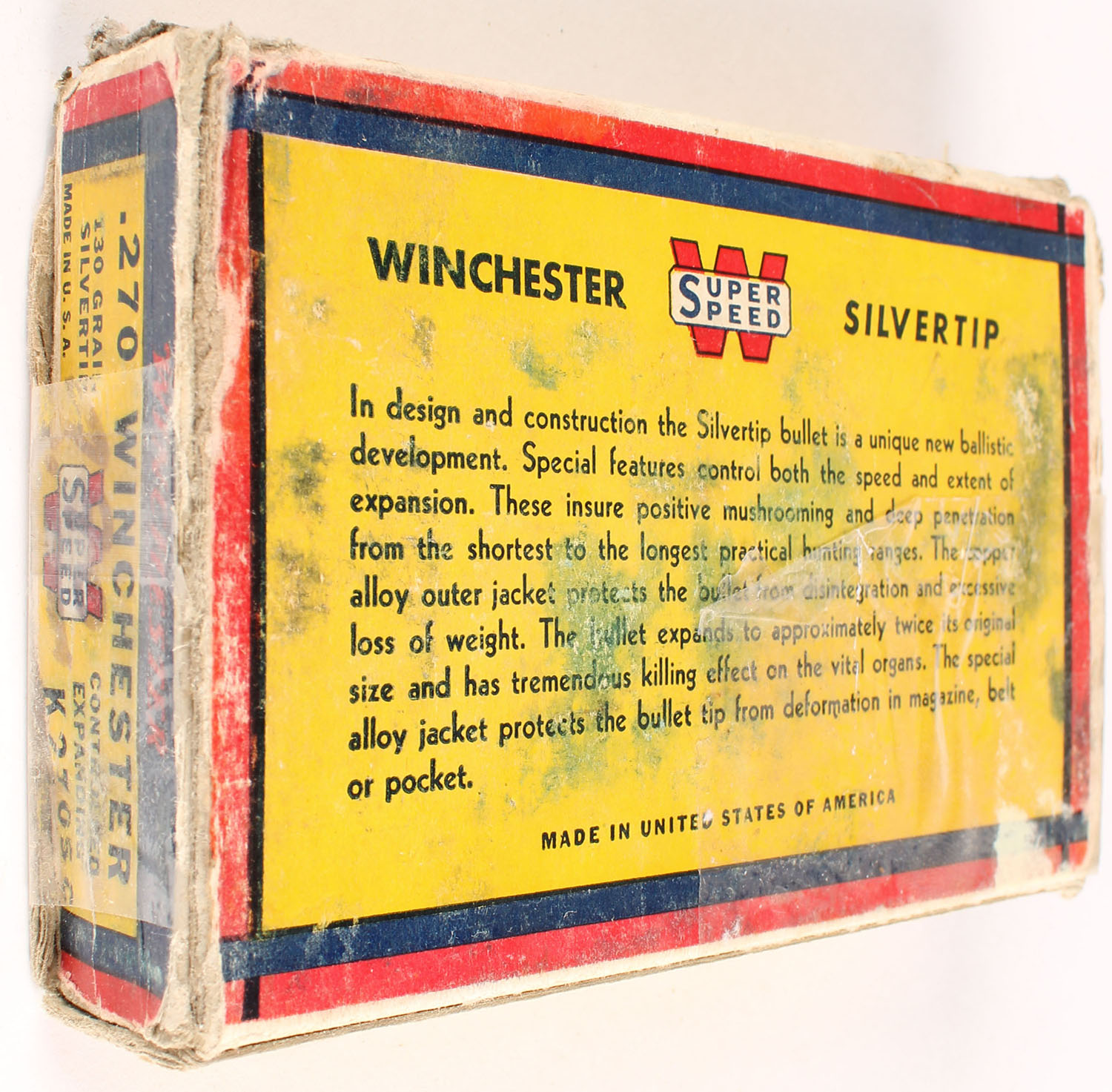 Winchester, Silvertip, .270 Winchester, 130 Grain Controlled Expanding Bullet, Full, 1pc. Yellow blue & red bear box, both end flaps are torn, very good color, some age soiling & color bleeding, tape going around box, edge & corner wear, ammo is excellent. Grade: Fair ++ - Value: 10 to 50