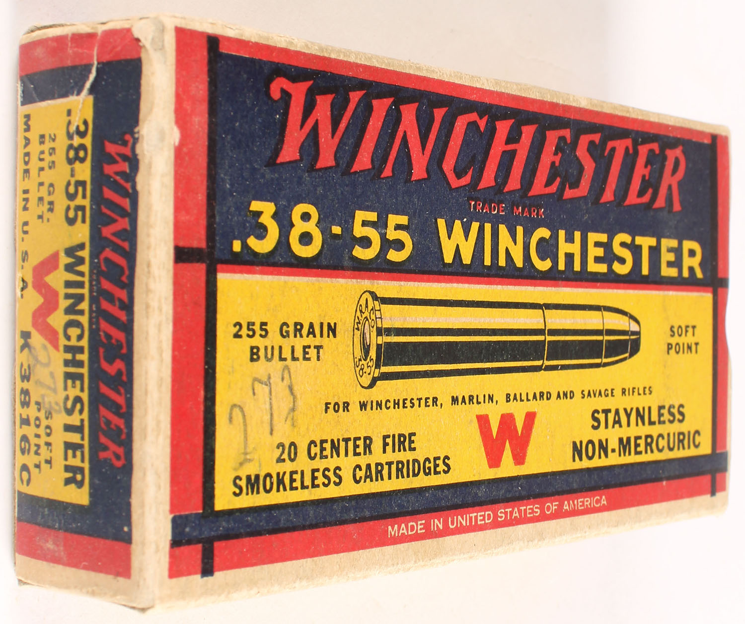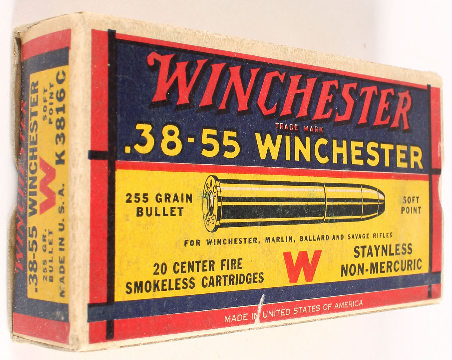 Winchester, Smokeless Cartridges, .38-55 Winchester, 255 Grain Soft Point Bullet, Partial 18rds., 1pc. Yellow blue & red box, box is solid with excellent color, minor age soiling & corner wear, very minor edge wear, top has been written on, end flaps are solid, ammo is excellent. Grade: Excellent - Value: 20 to 60