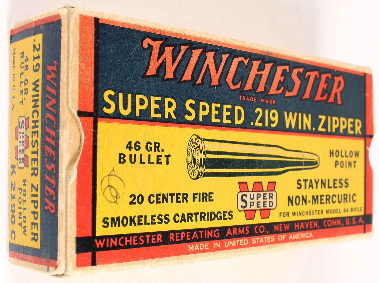 Winchester, Super Speed, .219 Zipper, 46 Gr. Hollow Point Bullet, Full, 1pc. Yellow blue & red box with insert, box is solid with excellent color, very minor color fading & corner wear, edges are mostly crisp, top has been written on, right end flap is torn, left end flap is solid, insert is very good, ammo is excellent. Grade: Excellent - Value: 100 to 400