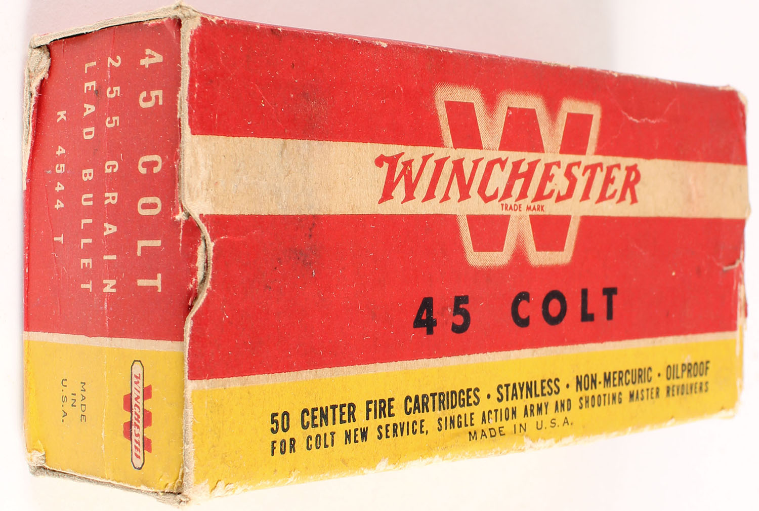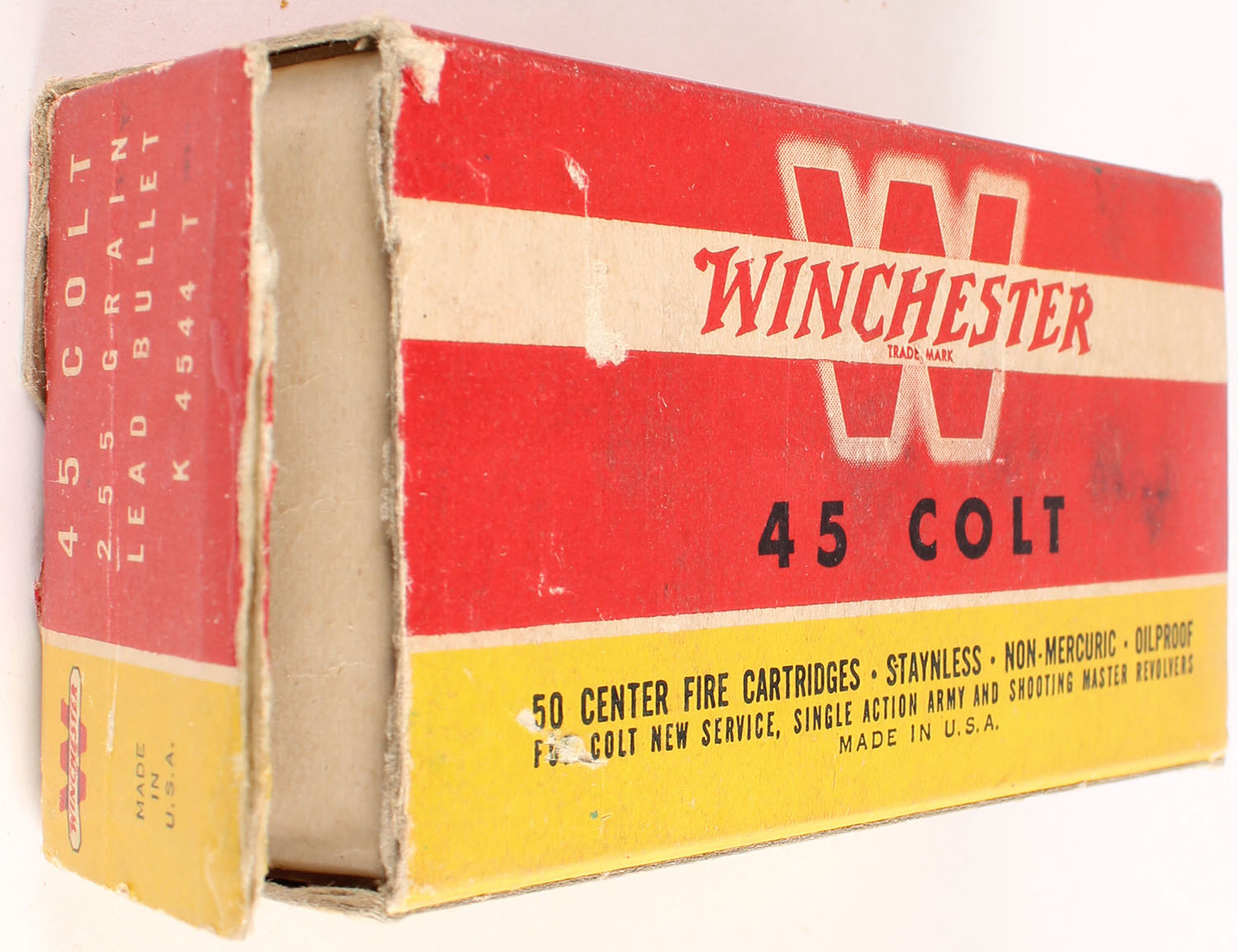 Winchester, Center Fire Cartridges, .45 Colt, 255 Grain Lead Bullet, Full, 1pc. Red yellow & white box, right end flap is torn, very good color, some age soiling & edge wear, corner wear, left end flap is solid, ammo is very good to excellent. Grade: Very Good - Value: 20 to 60