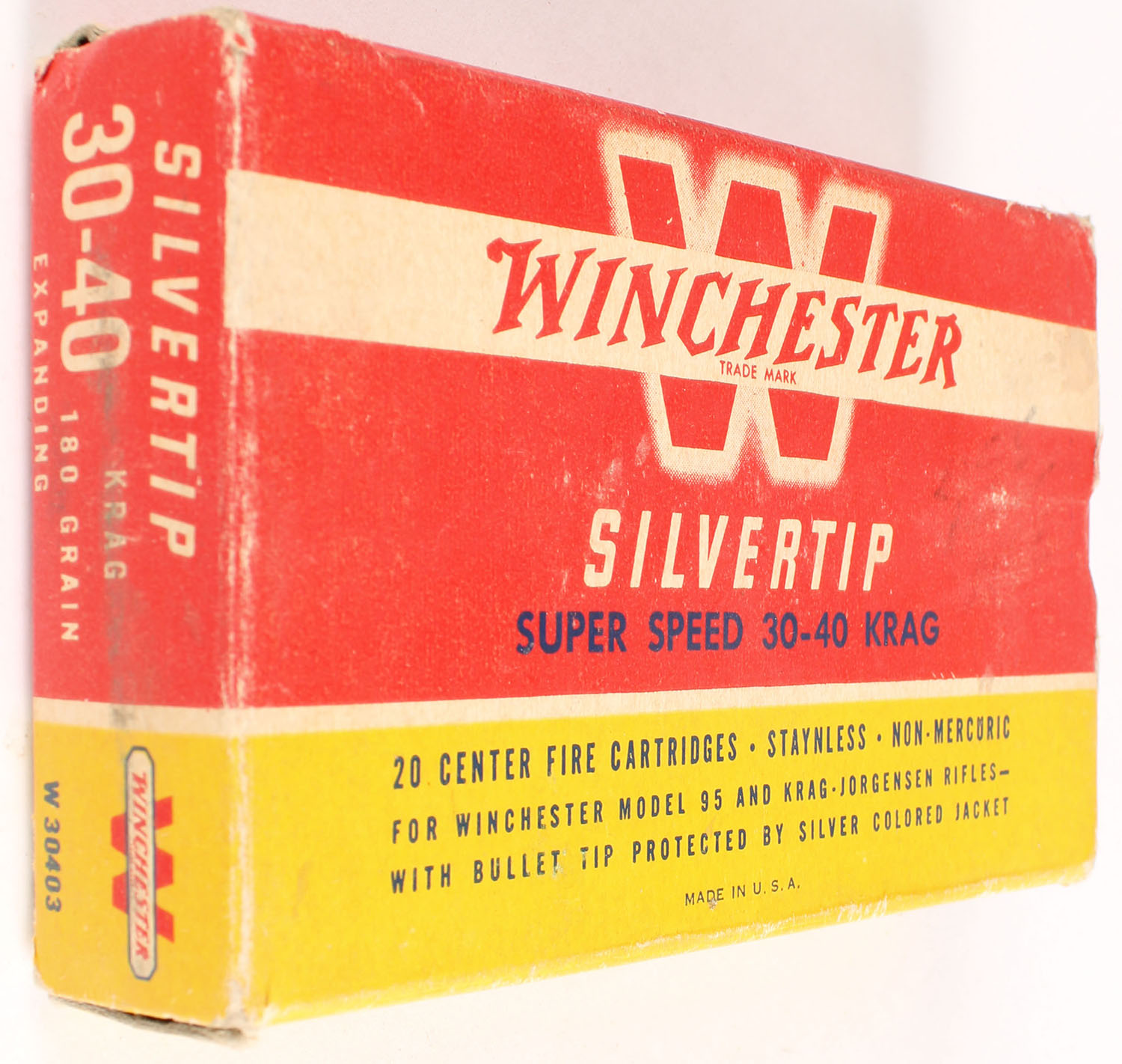 Winchester, Silvertip, .30-40 Krag (.30 Army), 180 Grain Controlled Expanding, Full, 1pc. Red yellow & white box, box is solid with very good to excellent color, some age soiling & staining, some corner wear, minor edge wear, top has been written on, end flaps are solid, ammo is excellent. Grade: Very Good ++ - Value: 20 to 80