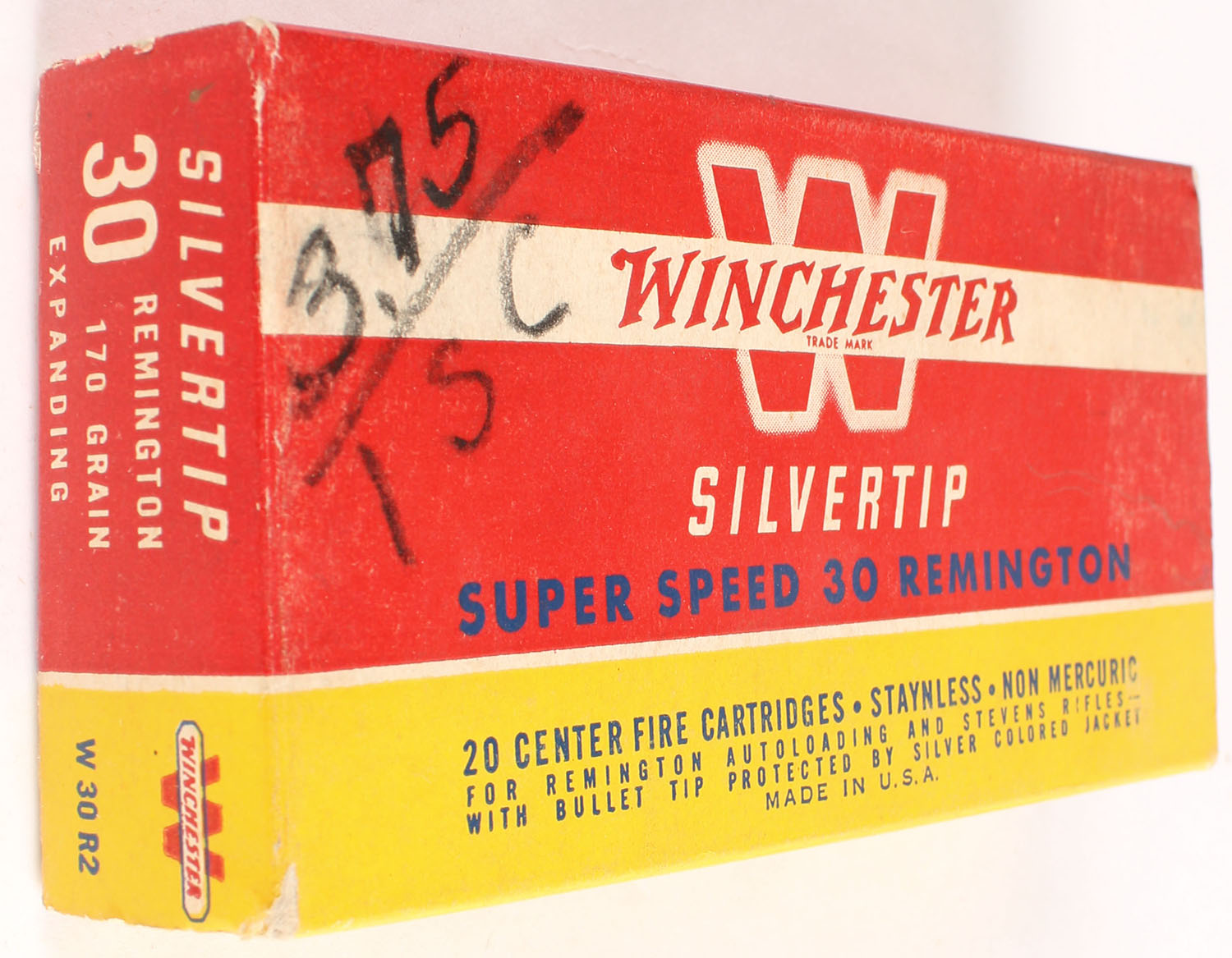 Winchester, Silvertip, .30 Remington, 170 Grain Controlled Expanding, Full, 1pc. Red yellow & white box, box is solid with excellent color, minor shelf & corner wear, edges are crisp, top has been written on, end flaps are solid, ammo is excellent to minty. Grade: Excellent - Value: 20 to 80