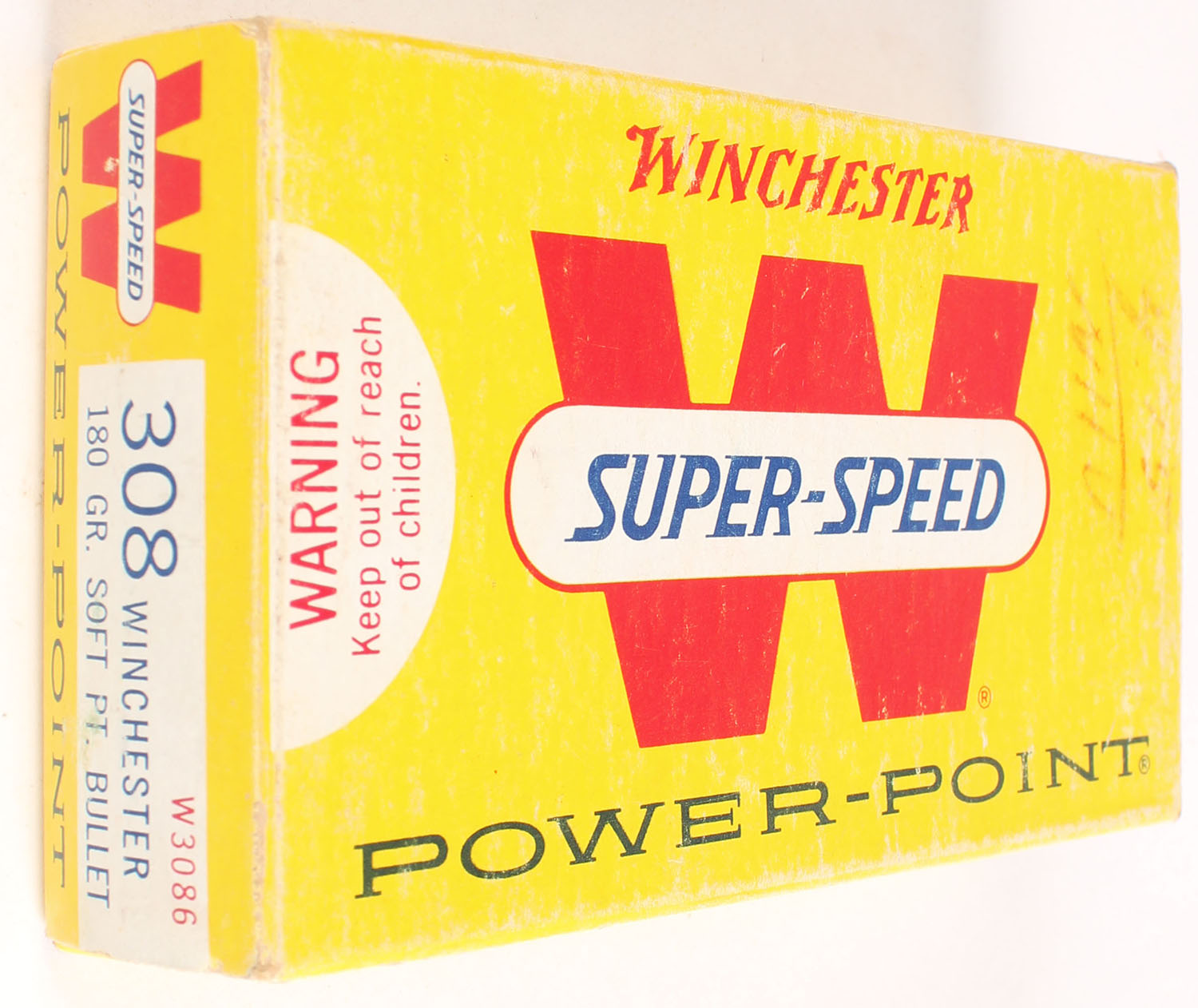 Winchester, Power-Point, .308 Winchester, 180 Gr. Soft Point Bullet, Full, 1pc. Yellow white & red box, box is solid with excellent color, some shelf wear, minor corner wear, very minor edge wear, top has been written on, end flaps are solid, ammo is excellent. Grade: Excellent - Value: 14 to 40