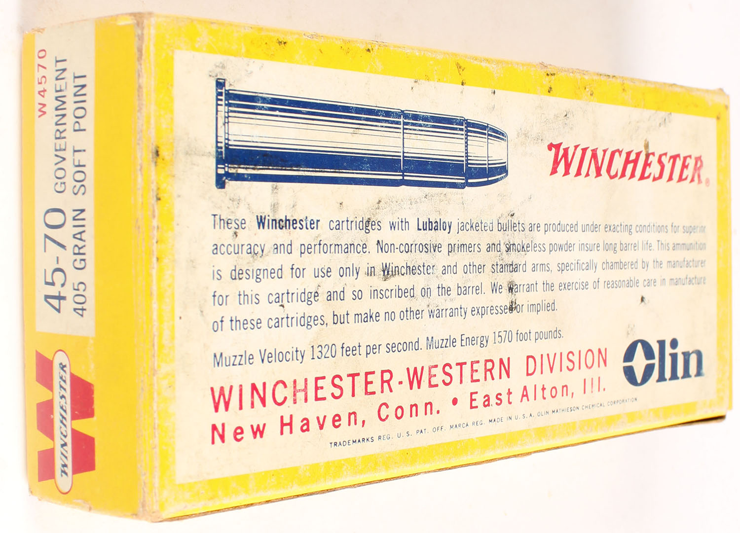 Winchester, Center Fire Cartridges, .45-70 Government, 405 Grain Soft Point, Full of incorrect ammo, 1pc. Yellow white & red box, box is solid with excellent color, some age soiling & staining, top has been written on, minor corner wear, edges are mostly crisp, end flaps are solid, ammo is very good to excellent. Grade: Very Good ++ - Value: 24 to 72