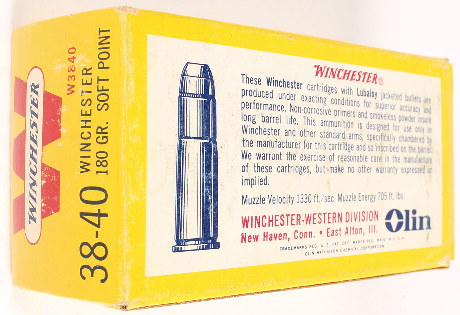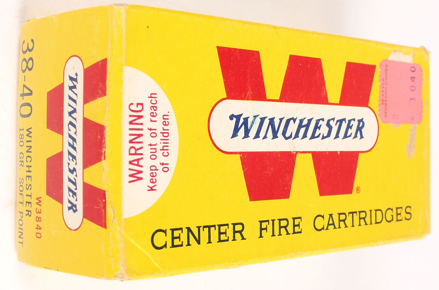 Winchester, Center Fire Cartridges, .38-40 Winchester, 180 Grain Soft Point, Full, 1pc. Yellow white & red box, box is solid with excellent color, very minor corner wear, edges are crisp, end flaps are solid, ammo is excellent. Grade: Excellent - Value: 40 to 120