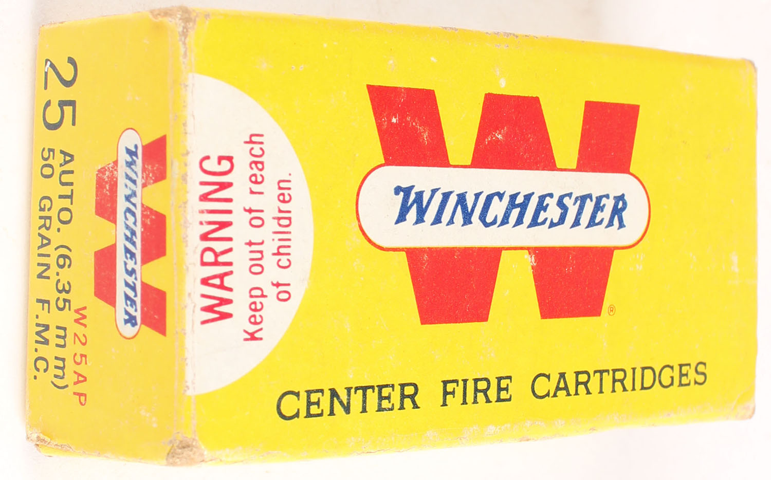 Winchester, Center Fire Cartridges, .25 Automatic (6.35mm), 50 Gr. Full Metal Case, Full, 1pc. Yellow white & red box, box is solid with excellent color, very minor shelf wear, some corner wear, minor edge wear, end flaps are solid, ammo is excellent. Grade: Excellent - Value: 10 to 40