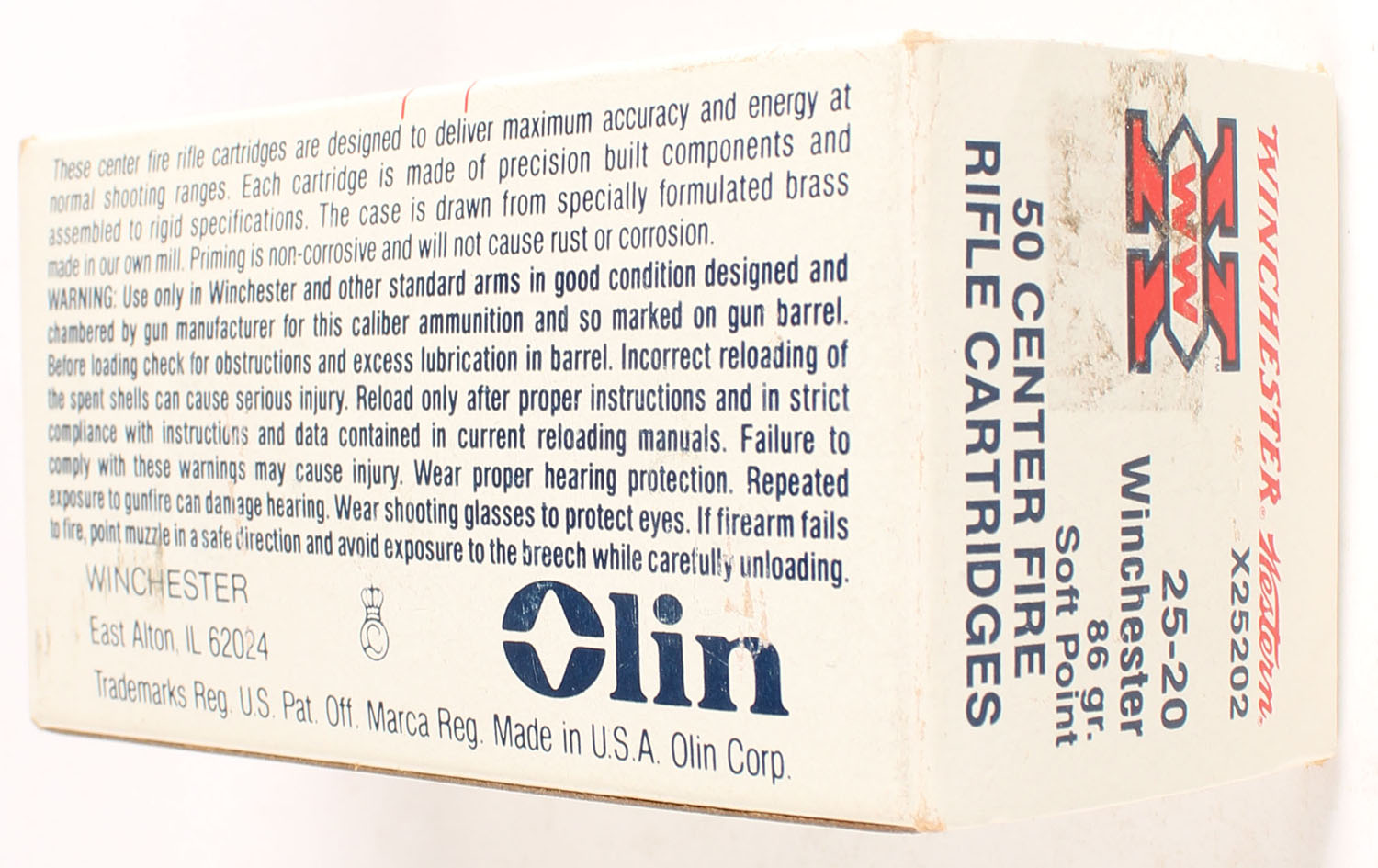 Winchester-Western, X, .25-20 Winchester, 86 Gr. Soft Point, Full, 1pc. White red & black box, box is solid with excellent color, sticker residue on right end, corners are sharp, edges are crisp, end flaps are solid, ammo is excellent. Grade: Excellent ++ - Value: 60 to 180