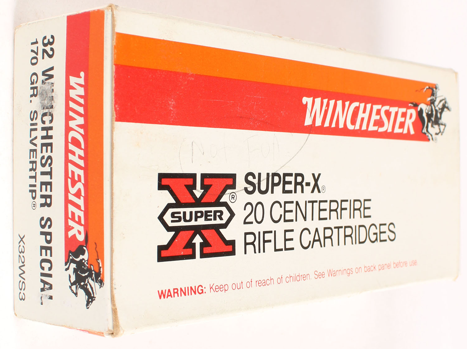 Winchester, Super-X, .32 Winchester Special, 170 Gr. Silvertip, Full of incorrect ammo, 1pc. White red & orange box, box is solid with excellent color, very minor age soiling & corner wear, very minor edge wear, top has been written on, end flaps are solid, ammo is excellent. Grade: Excellent - Value: 16 to 60