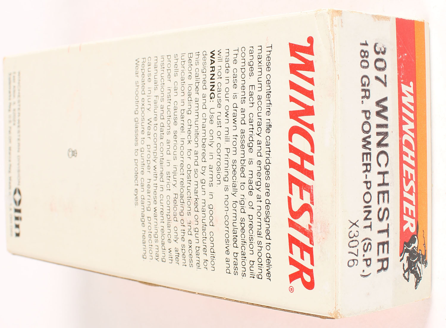 Winchester, Super-X, .307 Winchester, 180 Gr. Power-Point, Full, 1pc. Gray white & orange box, box is solid with excellent color, very minor shelf wear, minor corner wear, edges are crisp, end flaps are solid, ammo is excellent. Grade: Excellent - Value: 10 to 50