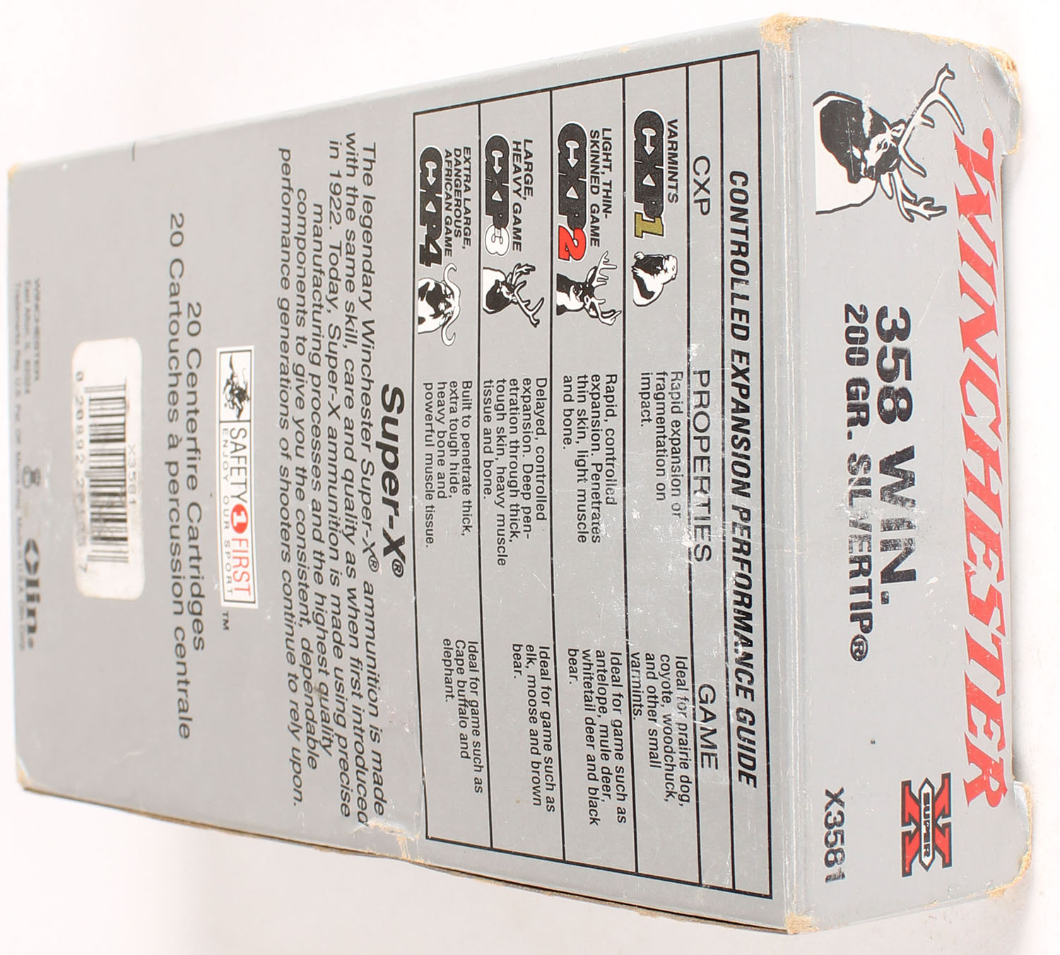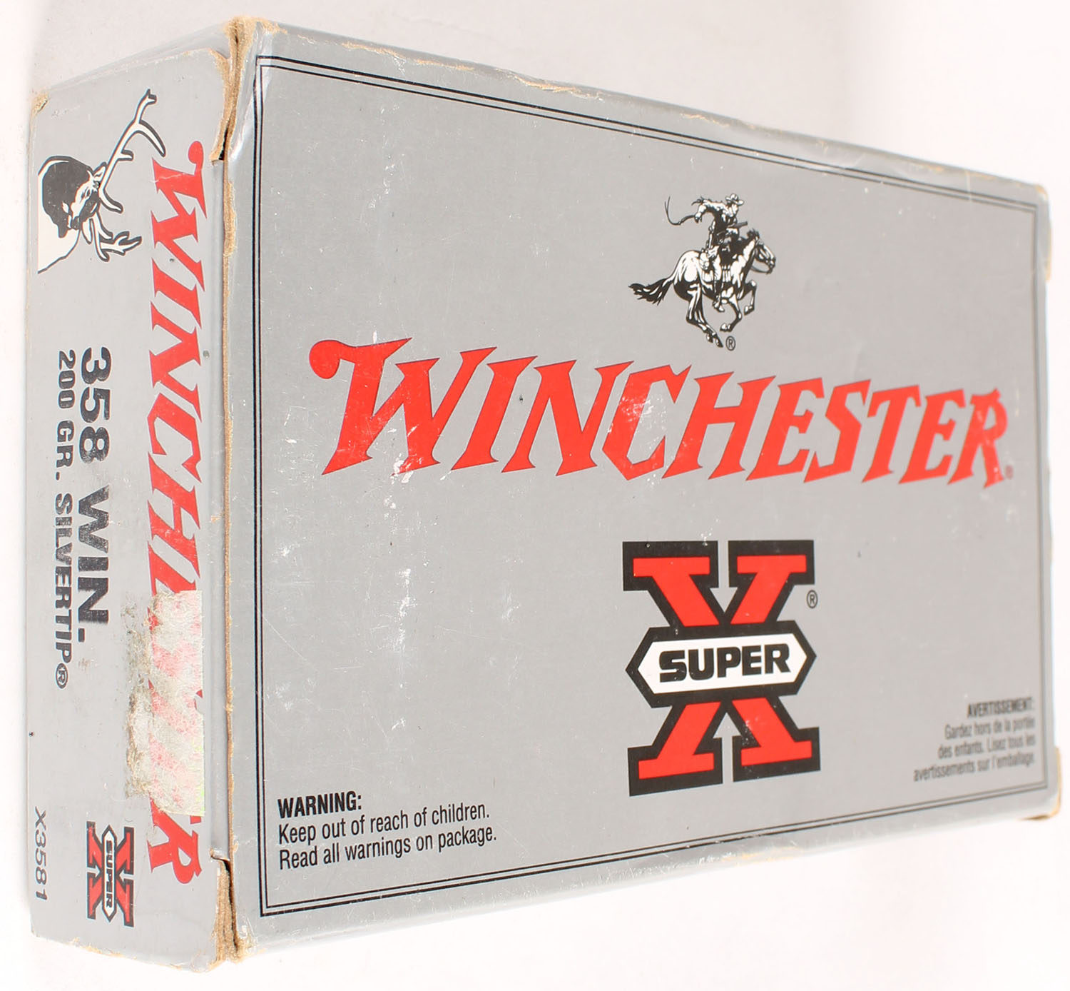 Winchester, Super X, .358 Winchester, 200 Grain Silvertip, Full, 1pc. Silver & red box, box is solid with minty color, some edge & corner wear, ammo is minty. Grade: Excellent + - Value: 30 to 90