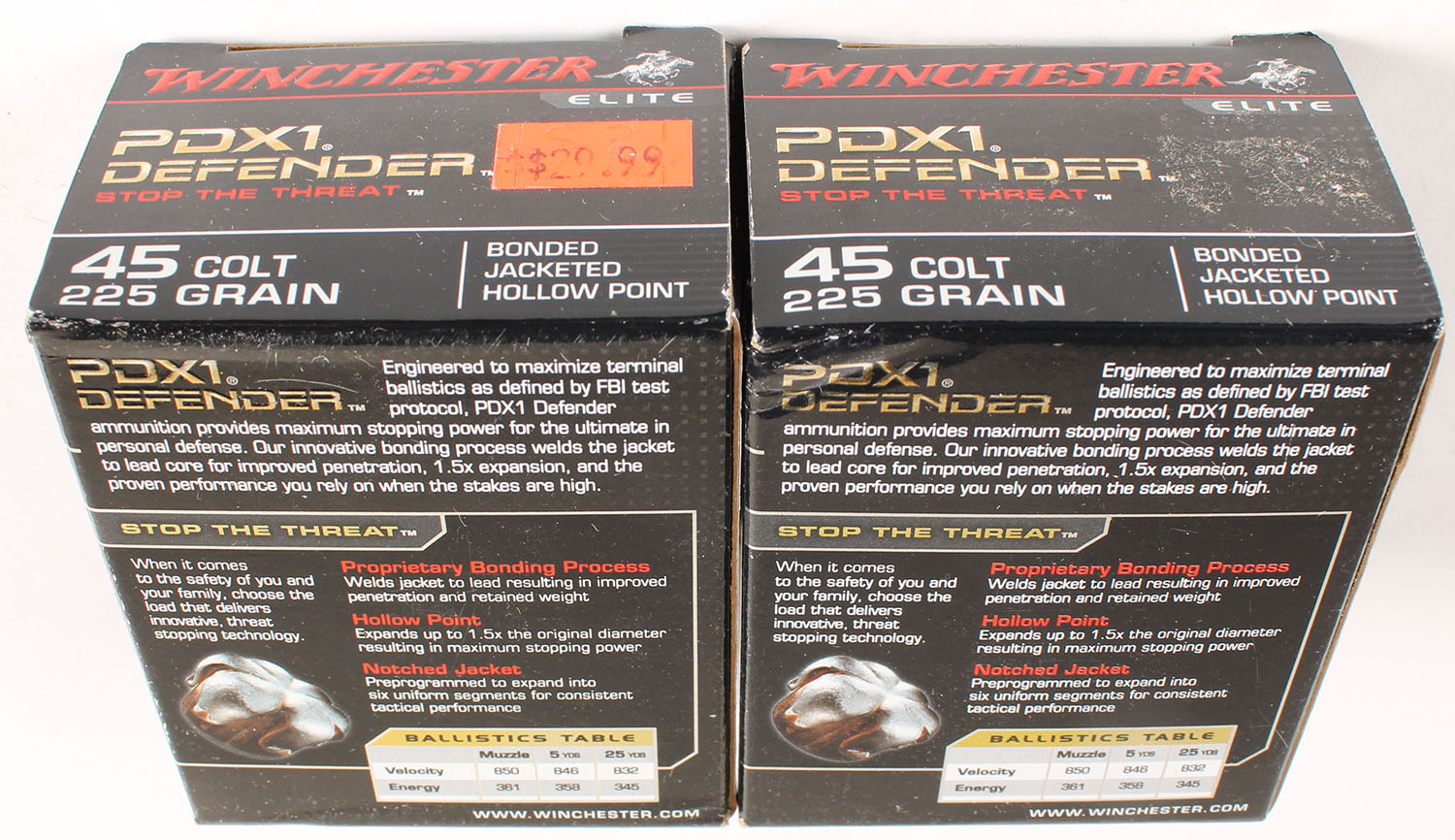 Winchester, Lot of (2), PDX1 Defender, .45 Colt, 225 Grain Bonded Jacketed Hollow Point, Full, 1pc. Black & red boxes, boxes are near mint with minty color, only very minor corner wear, edges are crisp, end flaps are solid, ammo is minty. Grade: Excellent ++ - Value: 20 to 60