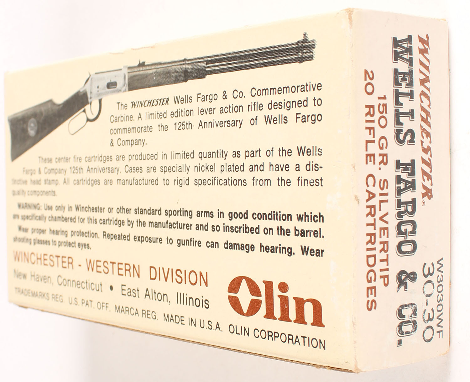 Winchester, Wells Fargo & Co., .30-30 Winchester, 150 Gr. Silvertip, Full, 1pc. Tan brown & black box, box is solid with excellent color to minty color, very minor shelf & corner wear, edges are crisp, end flaps are solid, ammo is minty. Grade: Excellent + - Value: 40 to 120