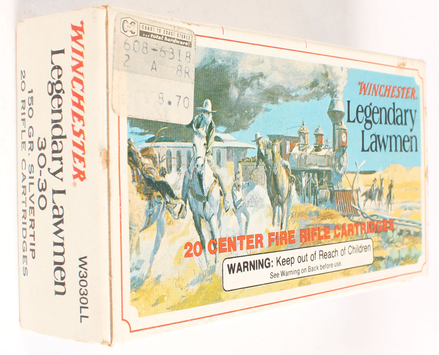 Winchester, Legendary Lawman, .30-30 Winchester, 150 Gr. Silvertip, Full, 1pc. Multi-colored box, box is solid with excellent color, very minor age soiling, very minor edge & corner wear, Coast to Coast sticker on top, end flaps are solid, ammo is minty. Grade: Excellent - Value: 40 to 120