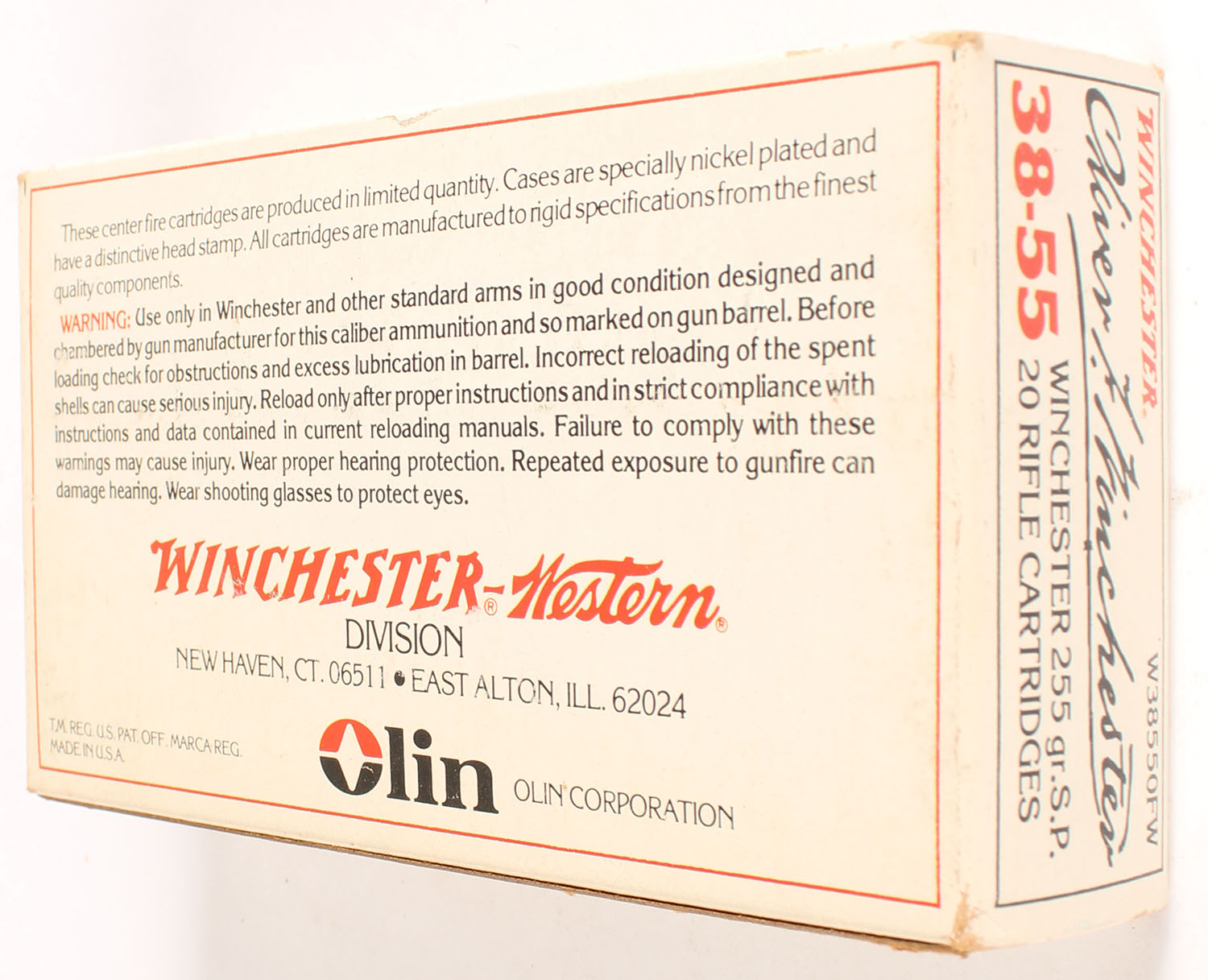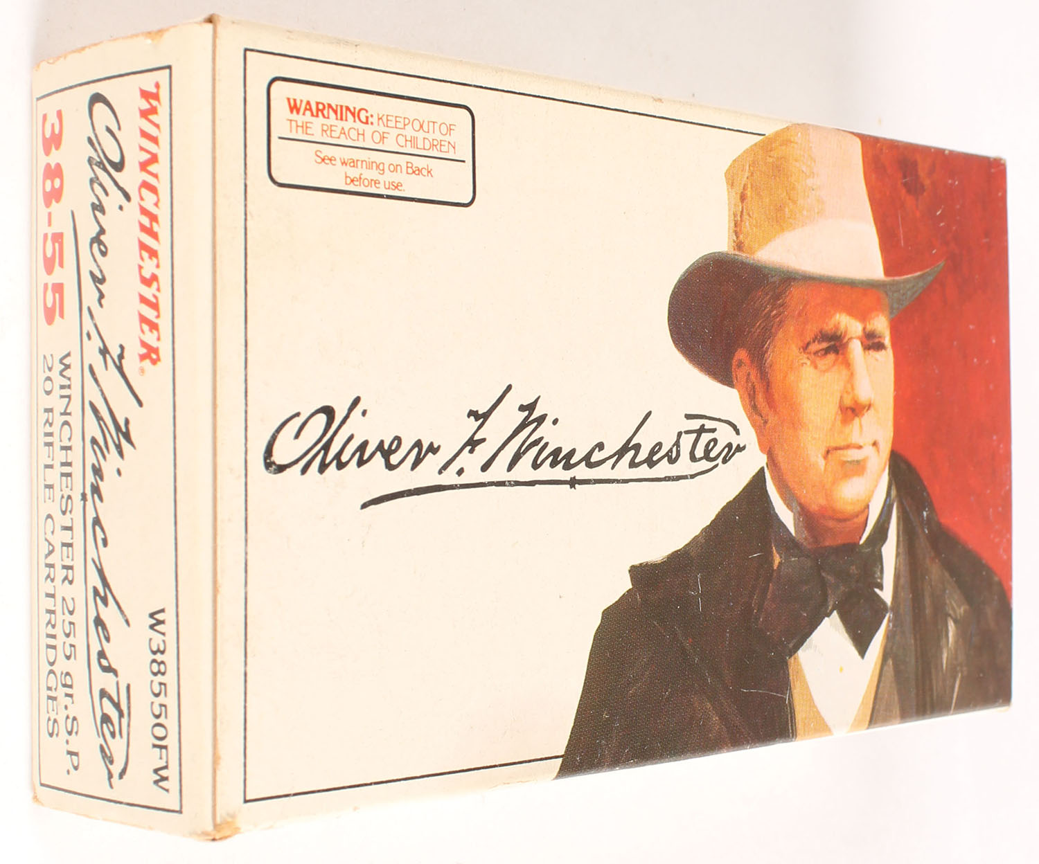 Winchester, Oliver F. Winchester, .38-55 Winchester, 255 Grain Soft Point, Full, 1pc. White box picturing Oliver Winchester, box is solid with excellent color, very minor age soiling, minor corner wear, edges are mostly crisp, end flaps are solid, ammo is excellent. Grade: Excellent + - Value: 30 to 90